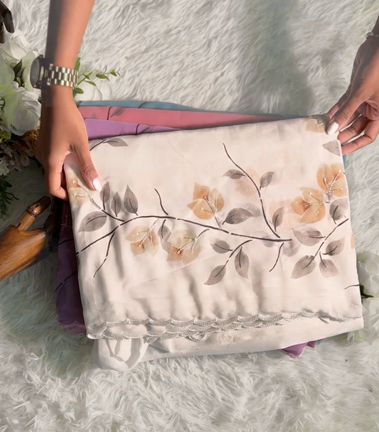 Featuring premium soft georgette that simplifies the draping process without compromising elegance. This collection addresses the needs of modern wearers who value both comfort and refined aesthetics.