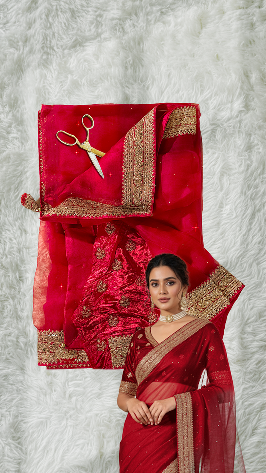 A timeless blend of grace and grandeur Sabya features delicate floral gold embroidery on a soft, sheer organza base that drapes effortlessly. The saree is paired with a rich velvet blouse, beautifully embroidered in matching gold threads, adding a regal touch to the look.
