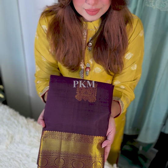 A rich Acai Purple shade, this Pure Handloom Kanchipuram Silk Saree features elegant Gold Ratham Motif Jari woven all over the body, exuding classic charm.