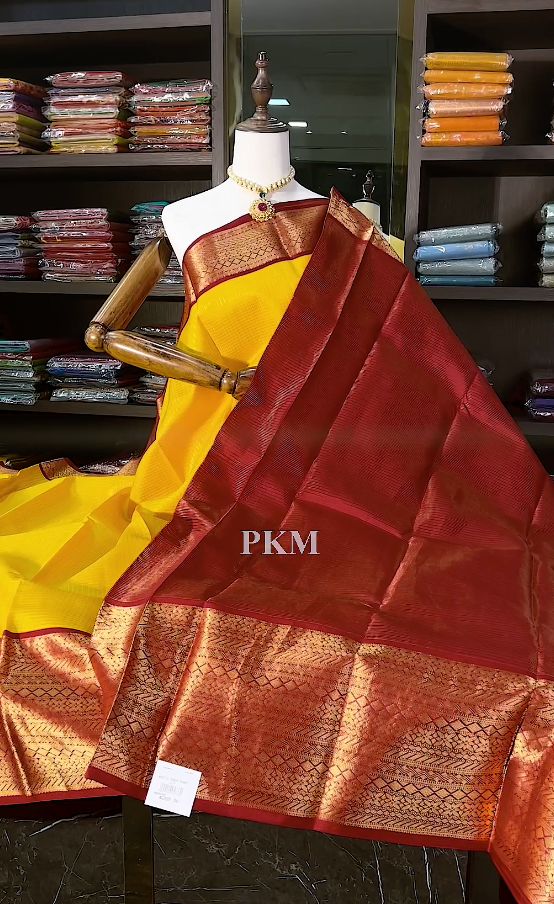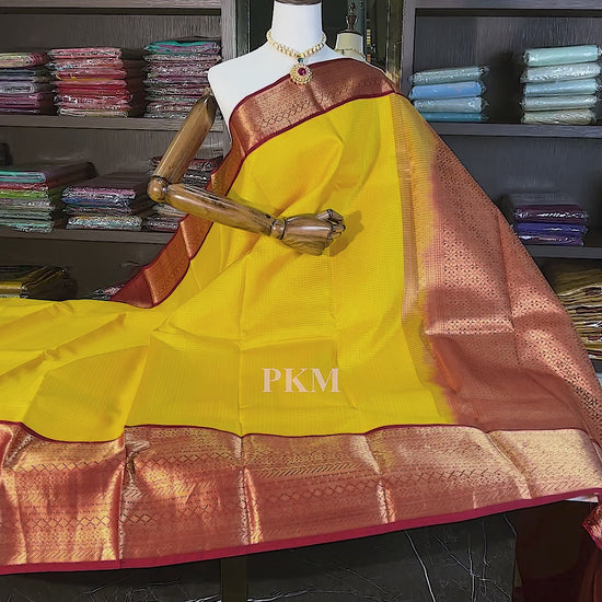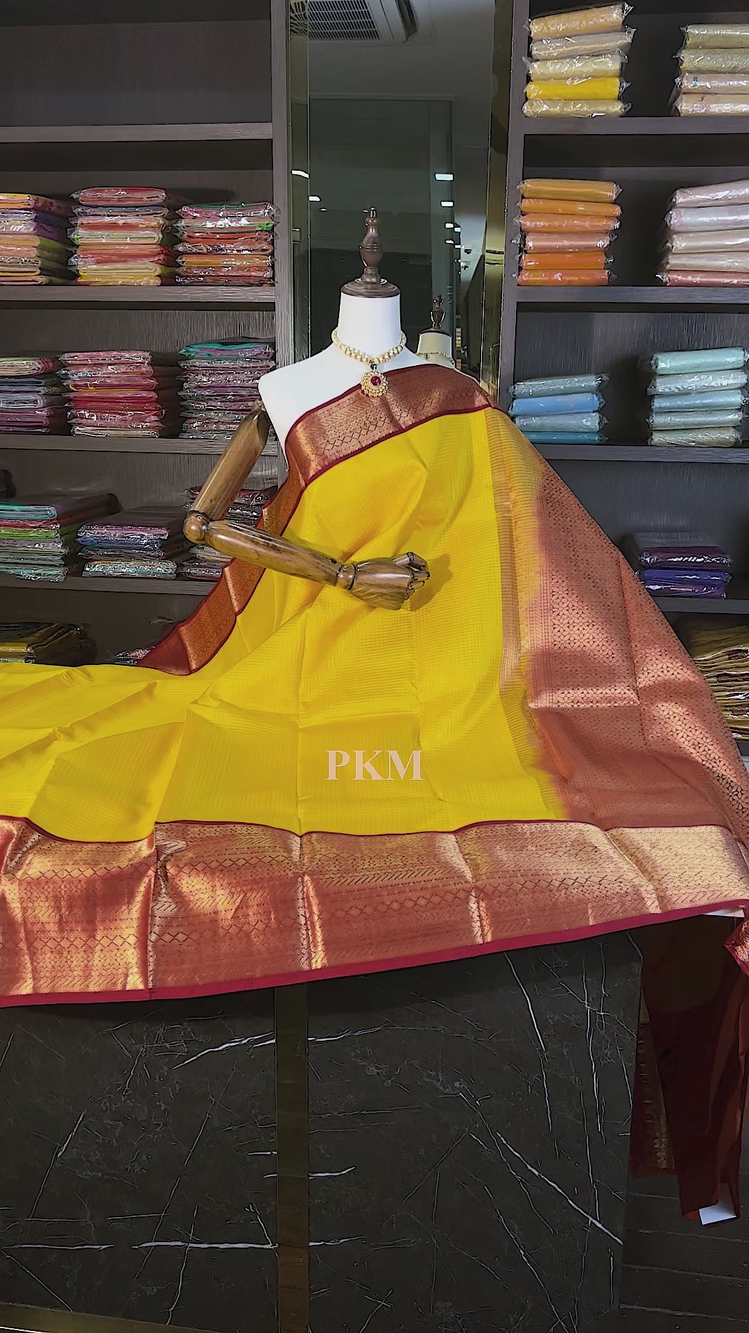 Amala Inspired, Pure Handloom Soft Silk with Gold Vaira Oosi Checks weaved all over the Manjal Yellow body and Maroon Red Korvai Gold Floral borders, contrast Maroon Red Gold Pallu. The contrast Maroon Red features Gold & Red stripes running horizontally across it.