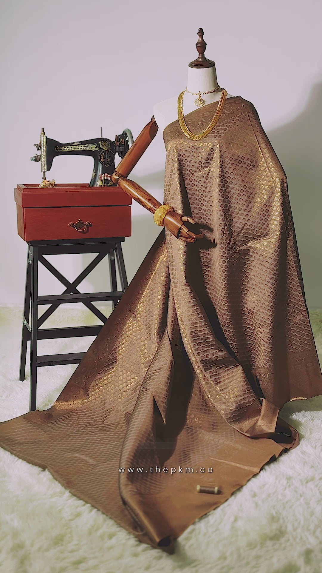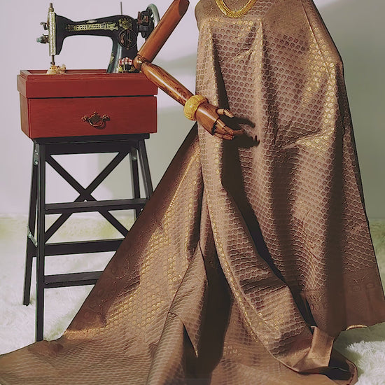 Antique Bronze on Grey semi-silk saree, beautifully adorned with Brocade Bronze Gold Flower Motif woven across the body. The look is completed with a running Bronze Gold Grey Pallu .