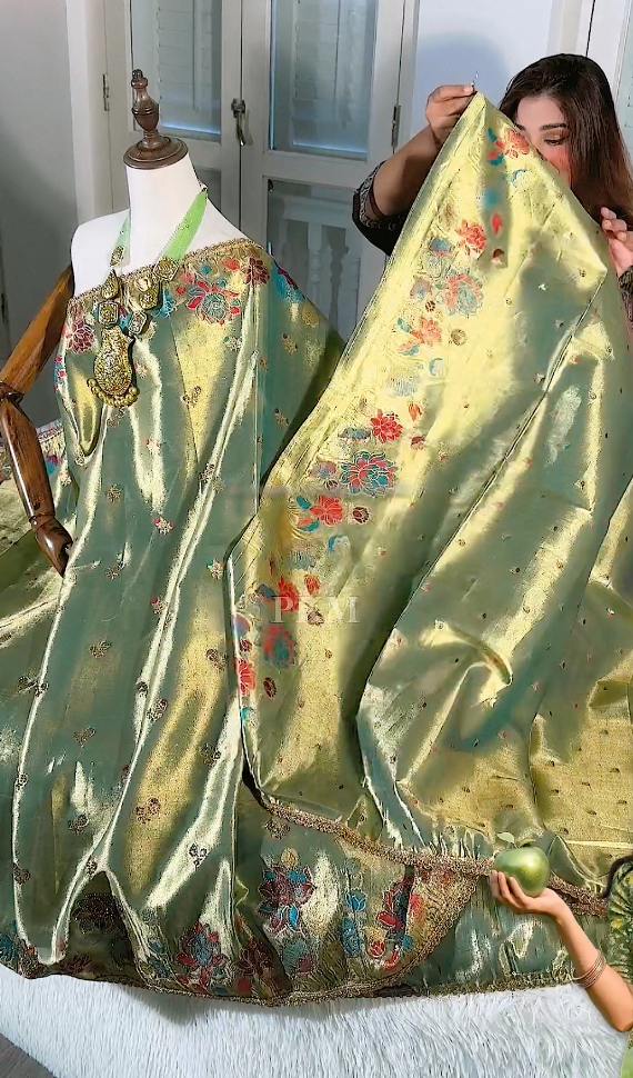 Apple Green Gold Shade Semi Tissue Silk saree features a striking combination of gold Swarovski Rhinestone work seamlessly throughout the body. The saree's elegance is highlighted by its running Shiny Apple Green Gold Shade pallu, all tied together with delicate Lace Applique borders and the classic touch of Benarasi weaving.