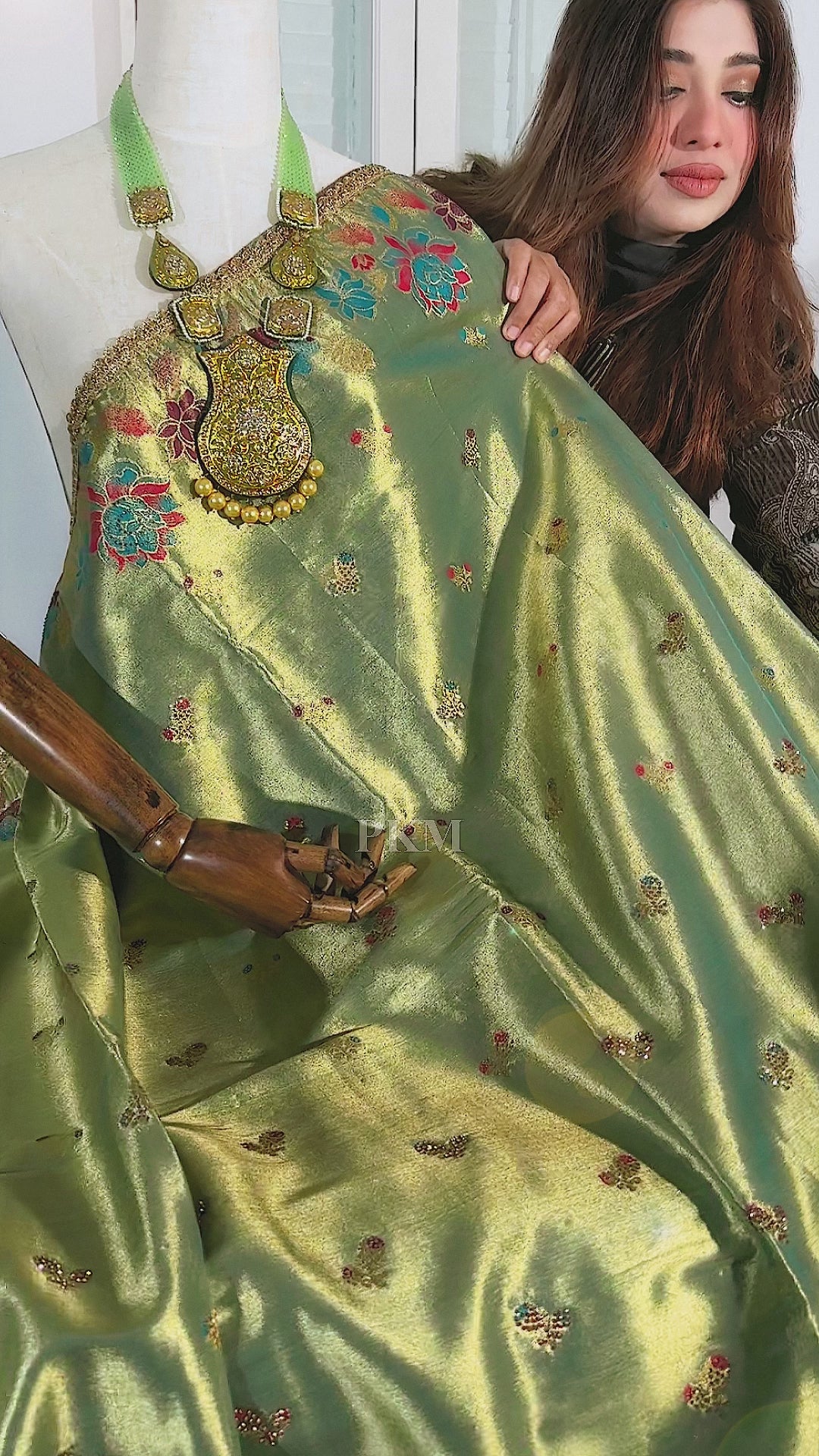 Running blouse in a Gold Embossed Shiny Apple Green Gold Shade.