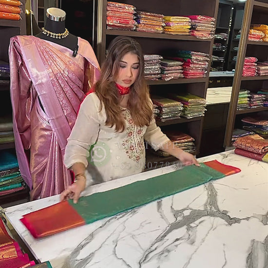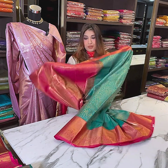 Aquamarine Green semi-silk saree, beautifully adorned with antique gold jari woven across the body. The look is completed with a contrasting Rani Pink pallu and a matching blouse for a striking finish.