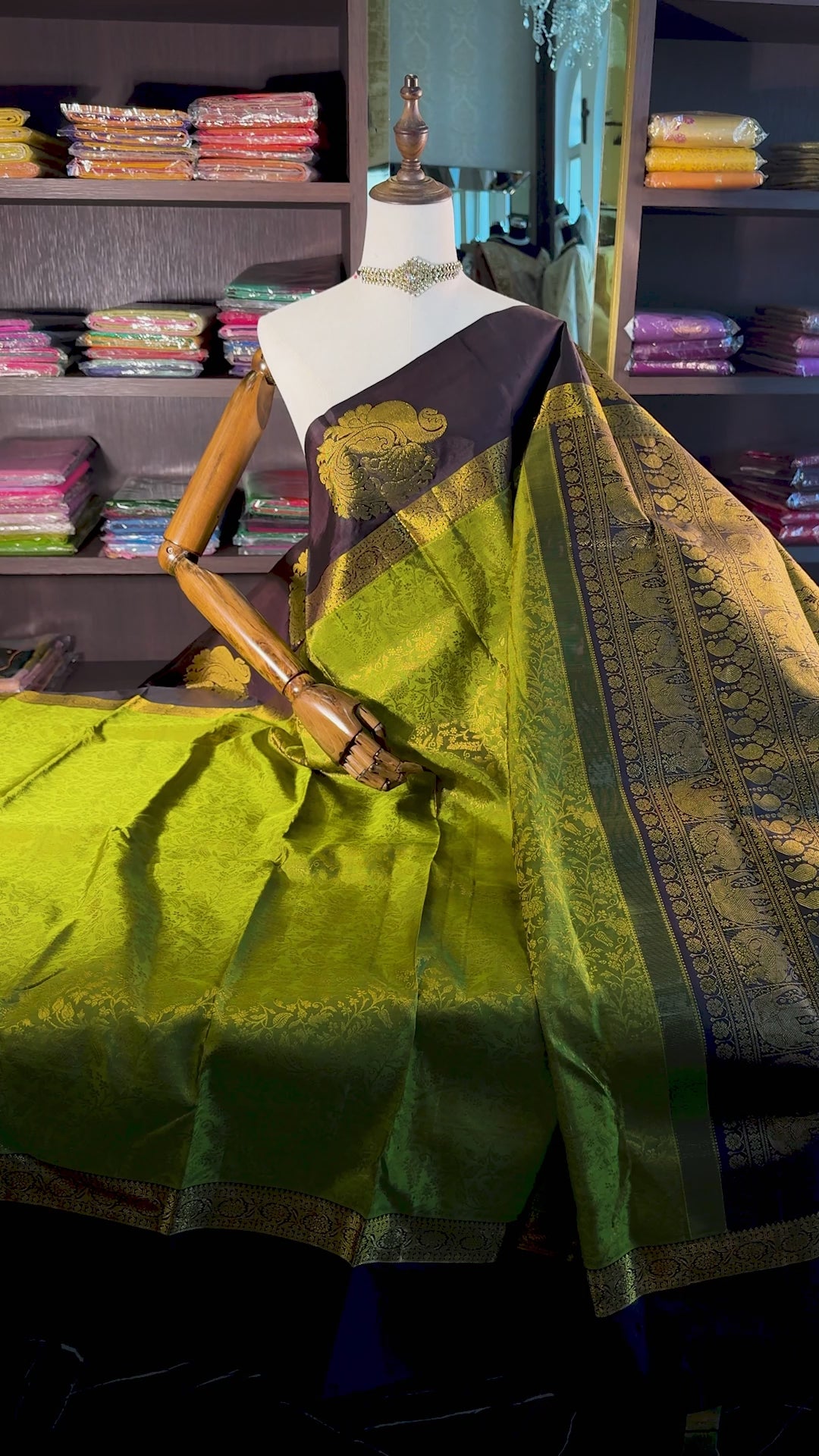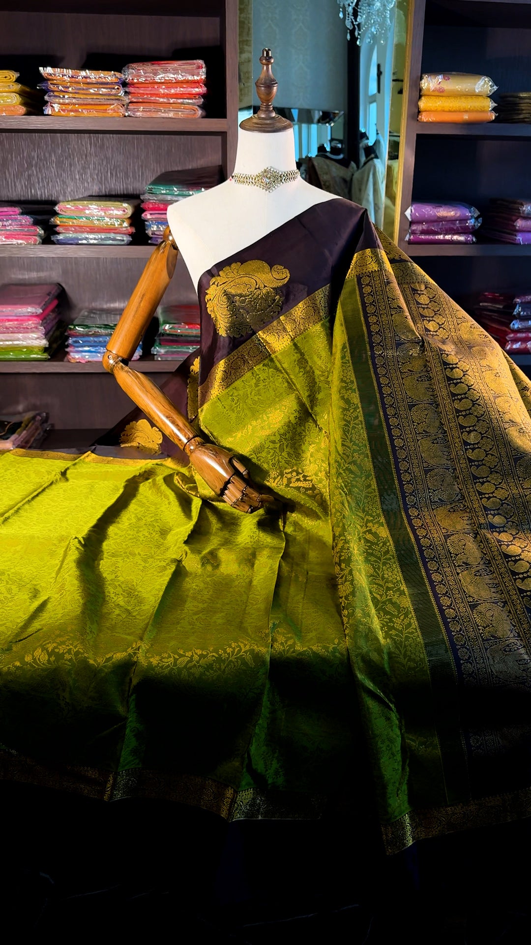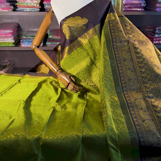 The saree is beautifully complemented by a contrasting Pakku Brown pallu, adorned with intricate Gold Peacock & Elephant motifs woven along the border.