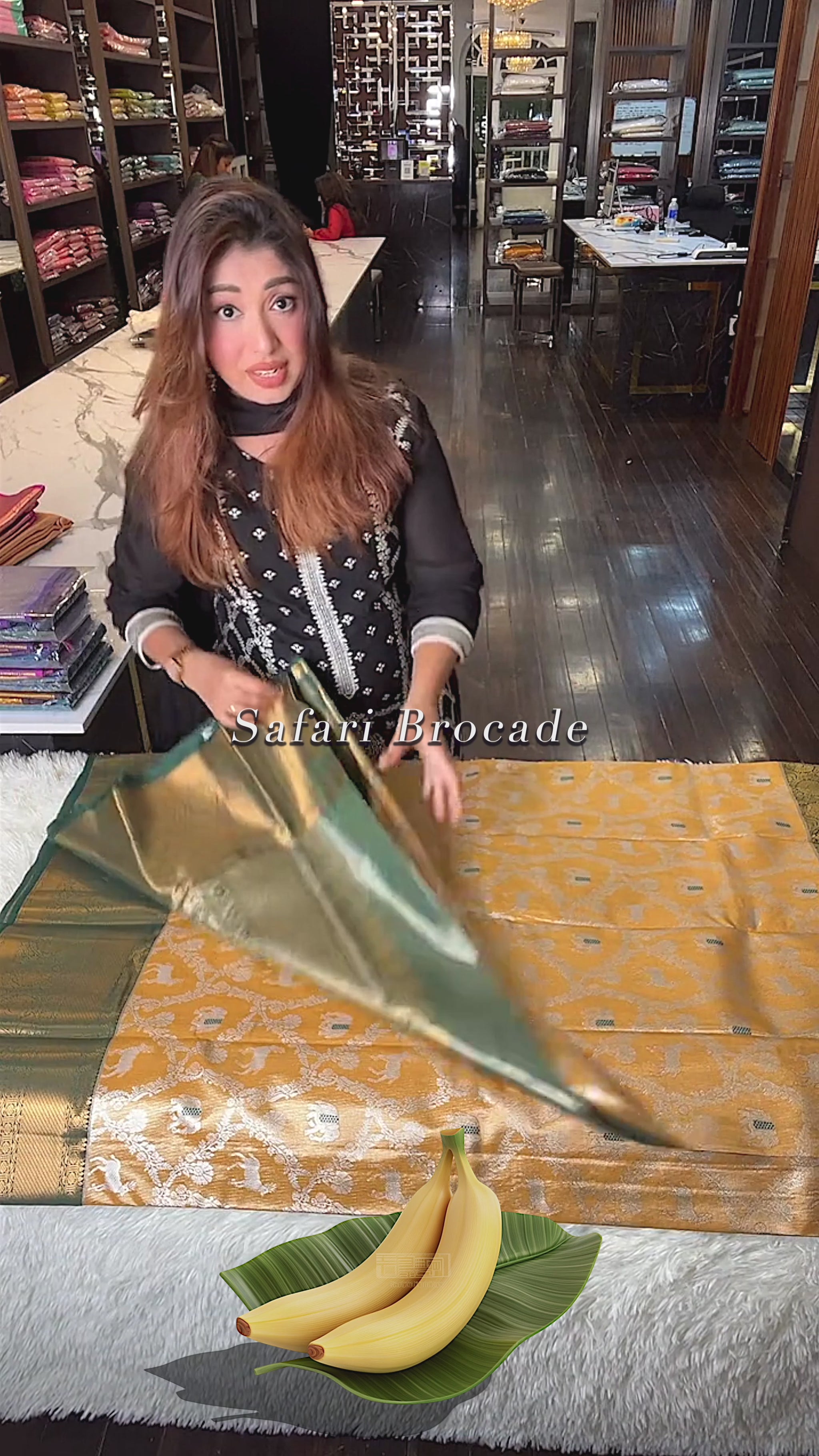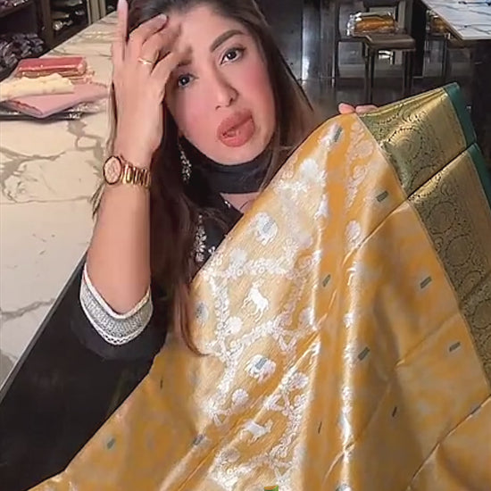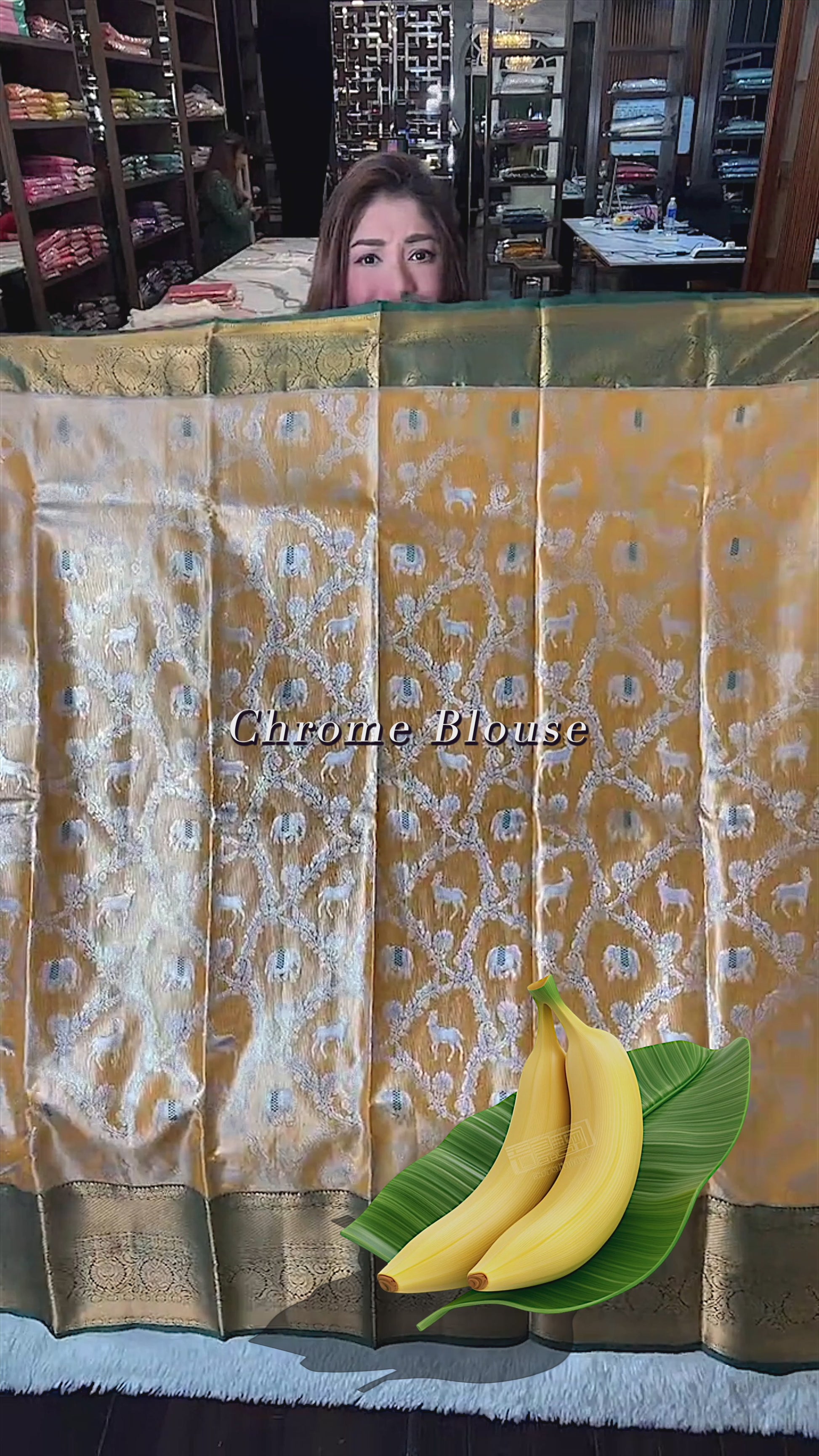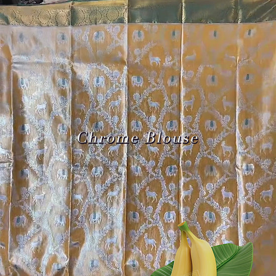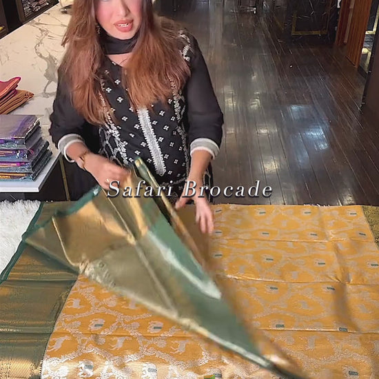 Banana Gold Safari Brocade semi-silk saree, beautifully adorned with Gold & Silver Jari woven across the body. The look is completed with a contrasting Chrome Green pallu and a matching blouse for a striking finish.
