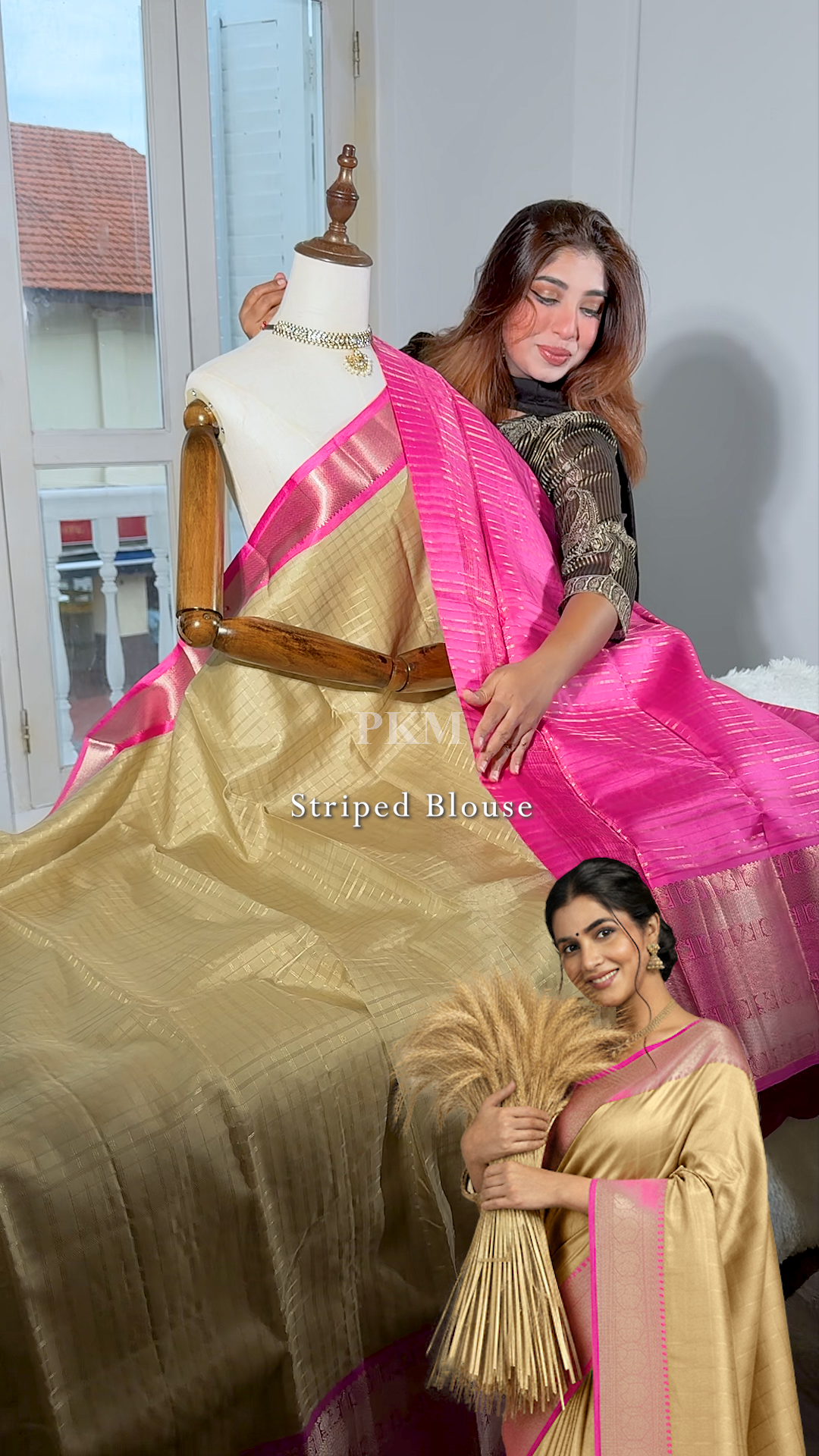 Barley Inspired, Pure Handloom Soft Silk with Gold Jari Kattam weaved all over the Barley Grain body and Gold Peacock & Elephant Motifs along the Rosy Pink Korvai borders. Gold Peacock, Elephant and Deer motifs weaved all over the contrast Rosy Pink Gold Pallu. The contrast Rosy Pink Blouse features Gold stripes running horizontally across it.