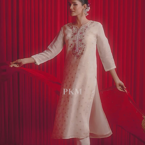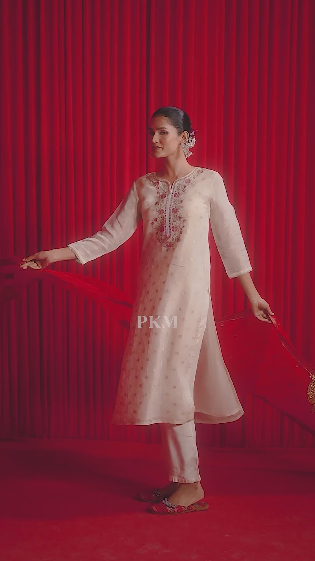 Woven Chanderi Gold Sand Suit with round neck. Gold Jari Coin Butta throughout suit and end of sleeves.