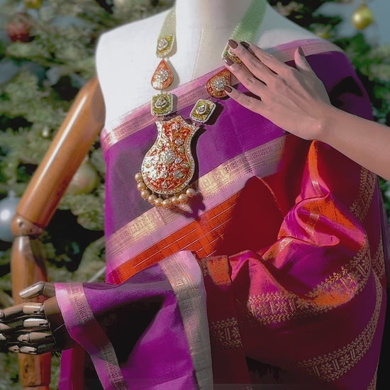 Blossom Pink-Orange Double Shade Pure Handloom Soft Silk with Silver & Gold Jari Kattam Checks woven all over the Body, completed with a running Blossom Pink-Orange Double Shade with Gold Floral Jari Stripes weaved across the Pallu.