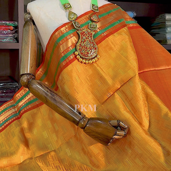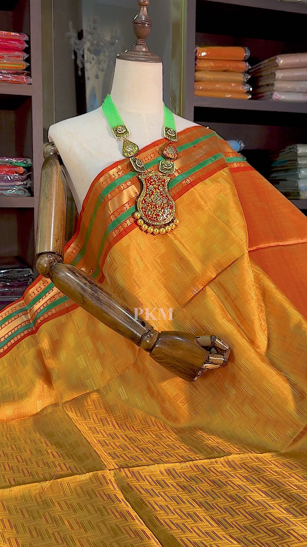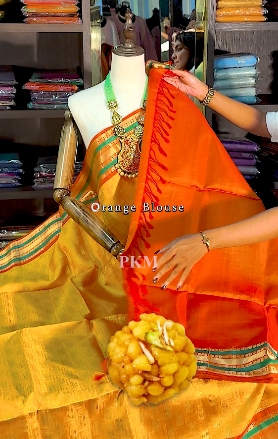 Boondi Laddu Manjal Yellow Shade Pure Handloom Brocade Soft Silk with Gold Geometric Motifs woven all over the Body, finished with Gold Ganga Jamuna of Green & Orange Borders and a contrasting Bright Orange Gold Pallu for a striking look.