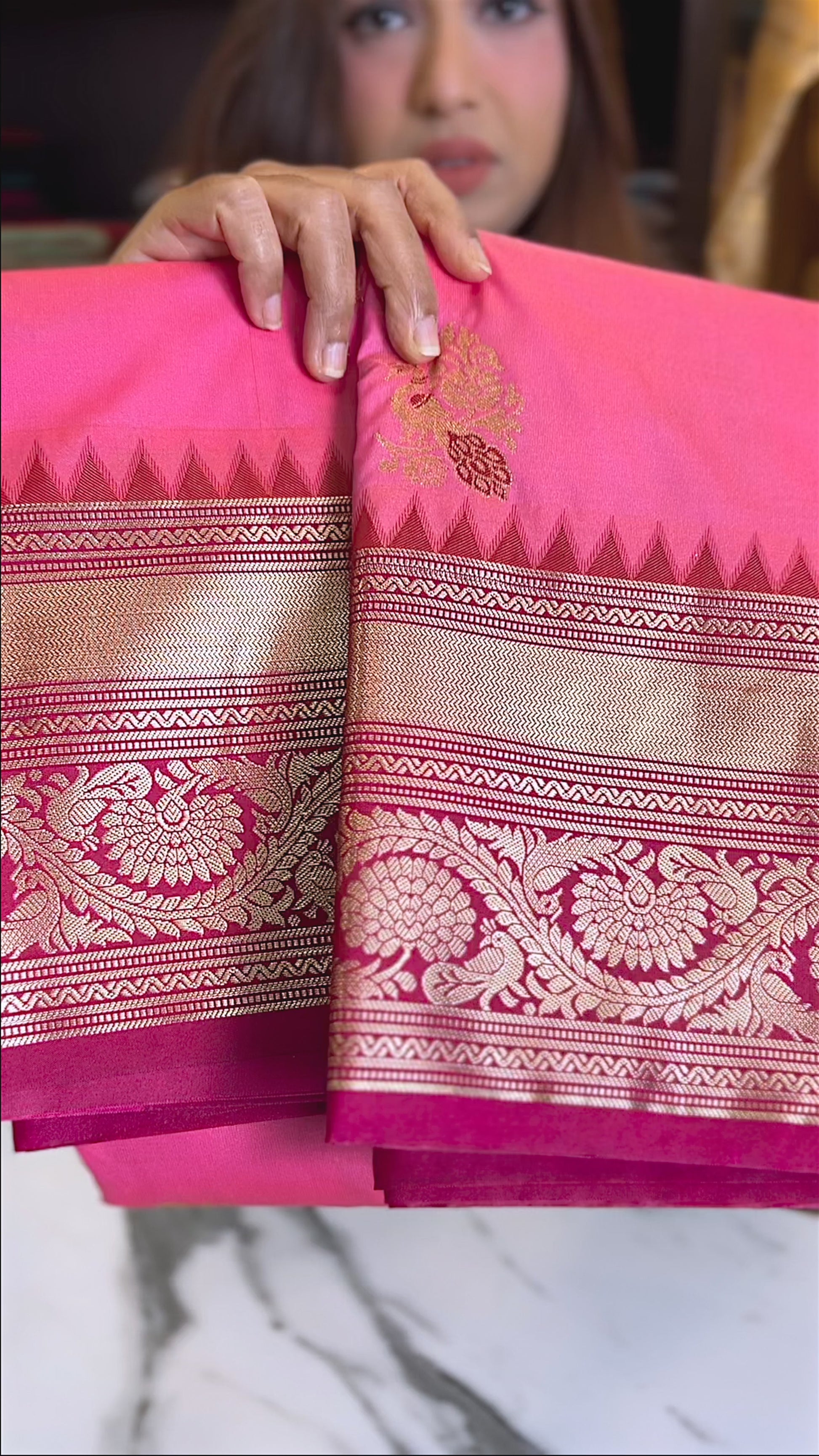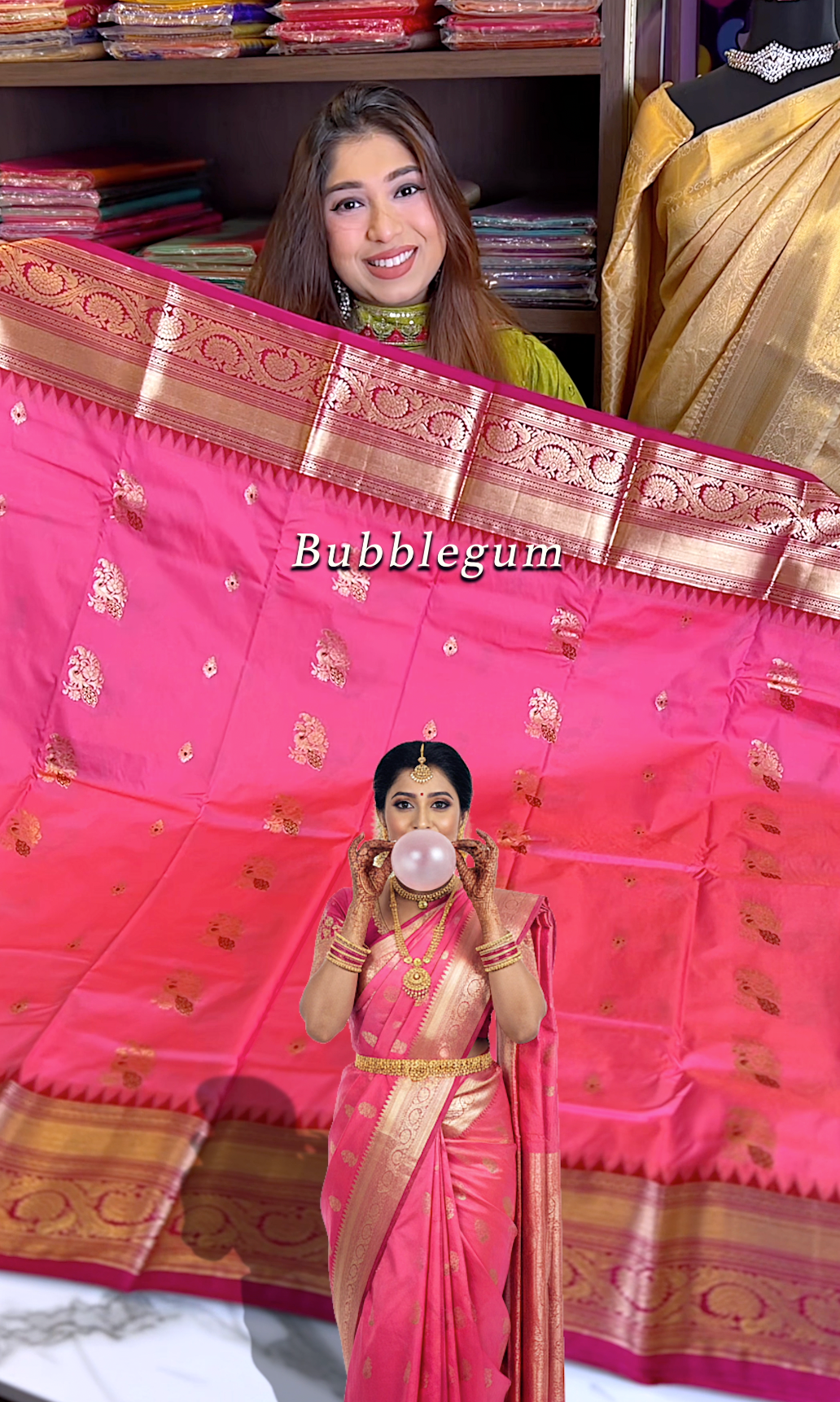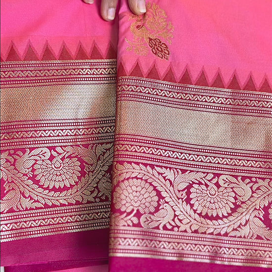 Bubblegum semi-silk saree, beautifully adorned with Champagne Gold Mayil Motif woven across the body. The look is completed with a contrasting Pink Pop Pallu.