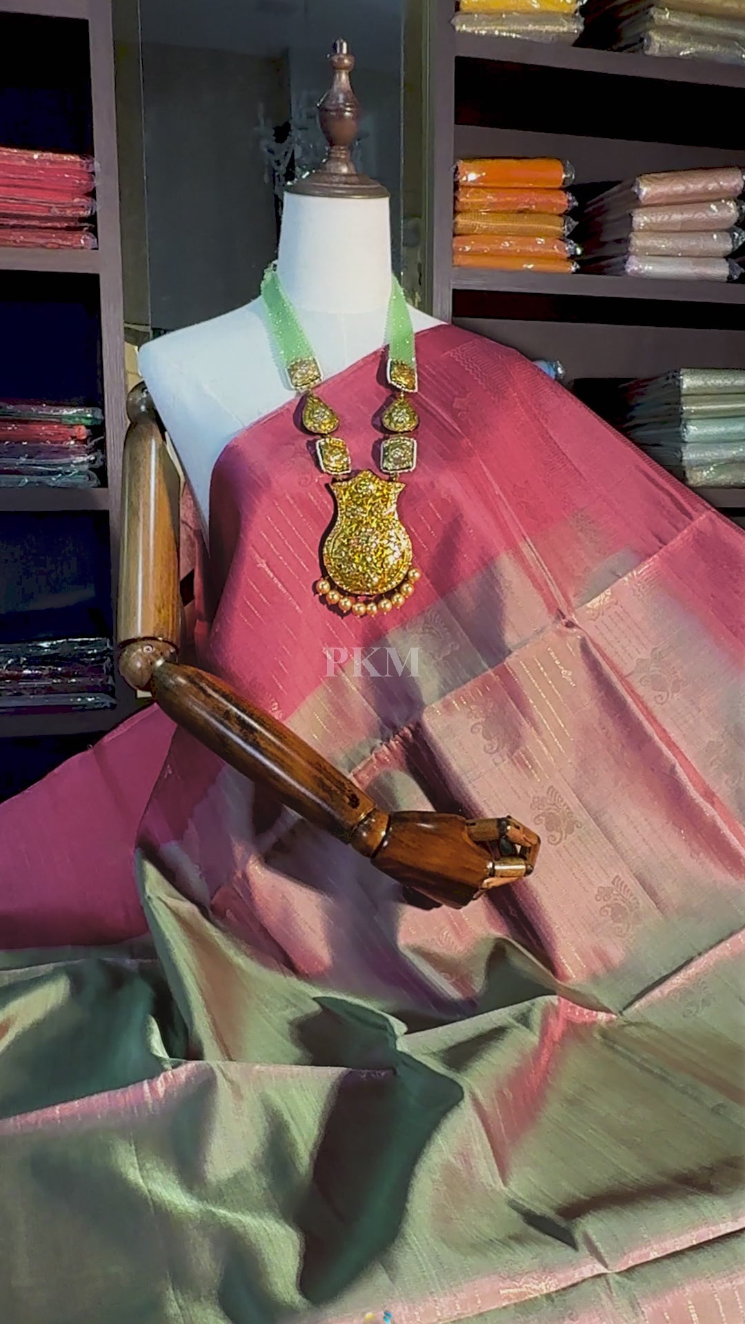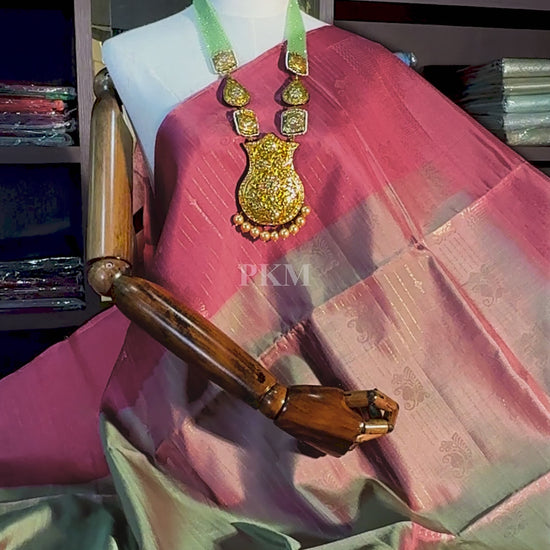 Iridescent Lilac Shade Pure Handloom Soft Silk with Gold Paisley Motifs woven all over the Body, finished with Soap Pink Borders and a contrasting Soap Pink Pallu for a striking look.