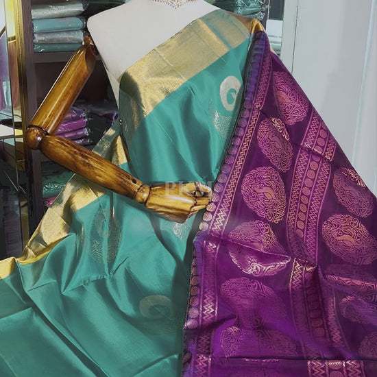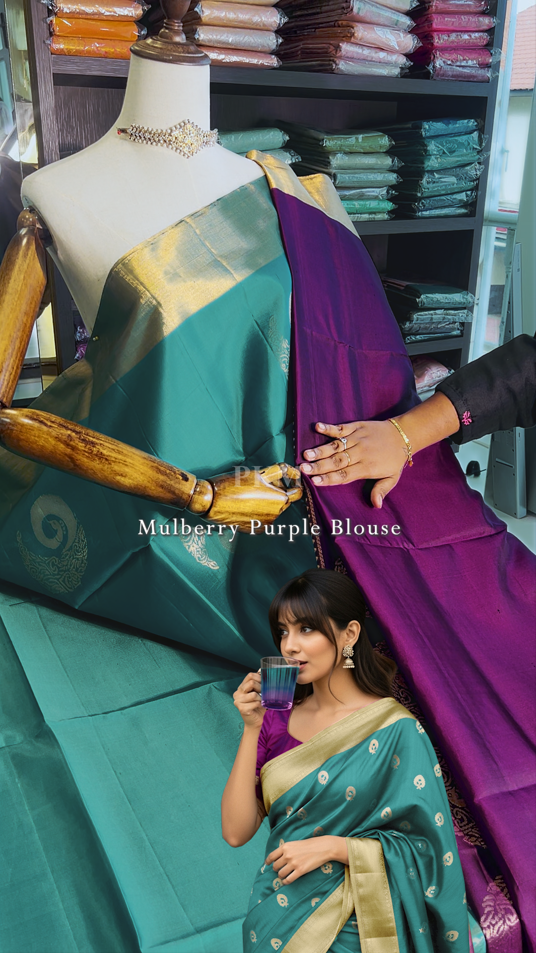 A stunning statement piece, this saree is crafted from Pure Handloom Soft Silk in a Blue Pea. The body is adorned with intricate, Gold Peacock Motifs that are meticulously spaced for a touch of refined elegance. Vibrant Mulberry Purple Pallu with Peacock Motif in Gold Jari and Gold Tissue Borders