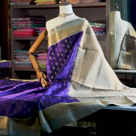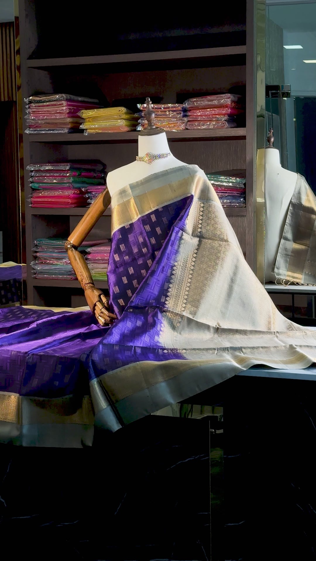 A stunning statement piece, this saree is crafted from Pure Handloom Soft Silk in a Cadbury Purple. The body is adorned with intricate, Gold Motifs that are meticulously spaced for a touch of refined elegance. Vibrant Silver Gray Pallu with Gold Jari and Gold Jacquard Borders