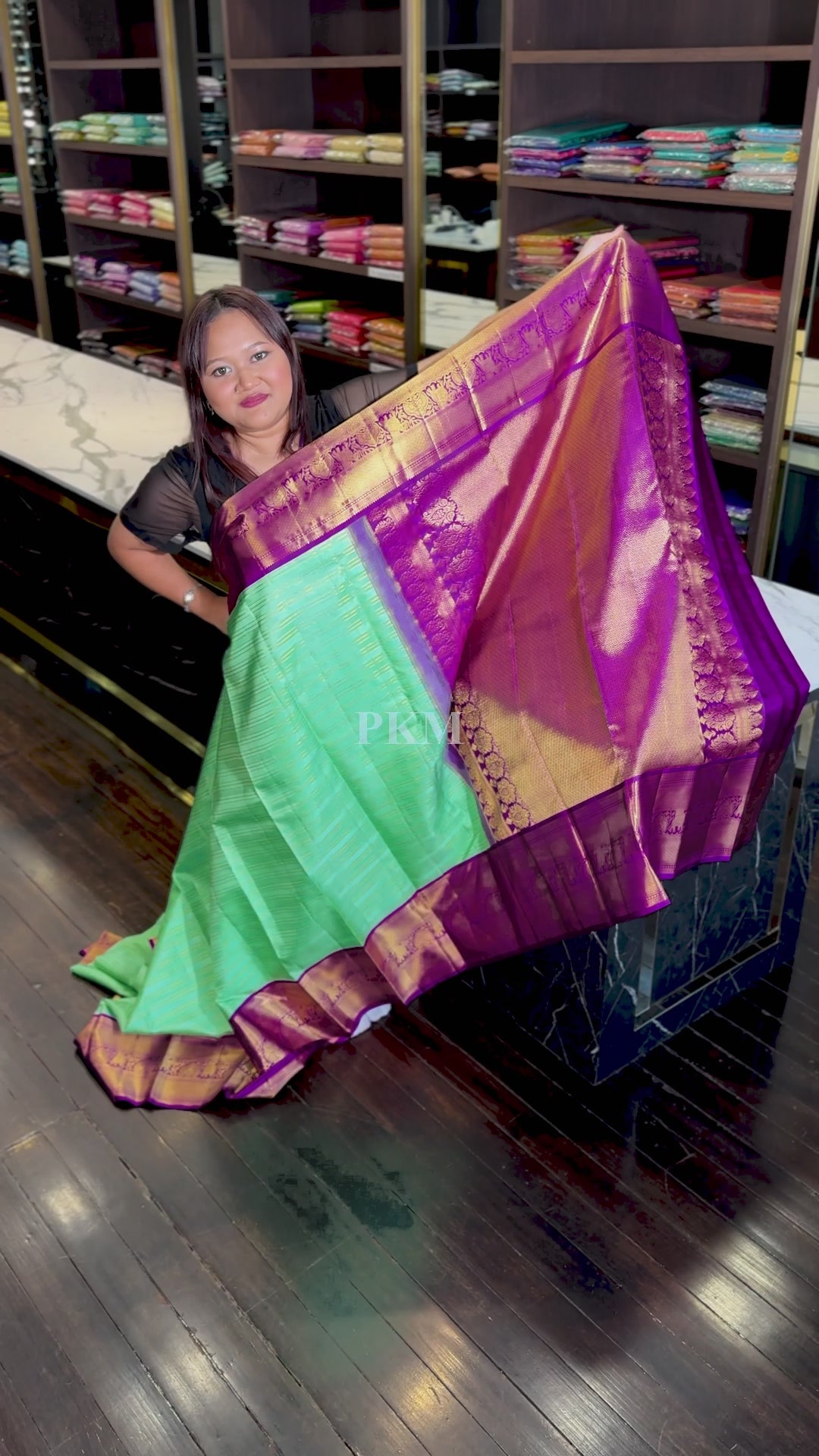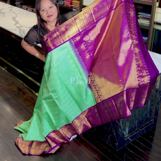 An elegant Caterpillar Green shade, this Pure Handloom Kanchipuram Silk Saree features delicate gold Jari Vari Stripes woven all over the body. Korvai Borders in Mulberry Purple with Gold Elephants.
