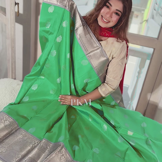 Ceramic Pot Inspired, Pure Handloom Soft Silk with Silver Flower Motif spaced out weaved all over the Ceramic Green body and Ash Clay Grey Silver borders, contrast Ash Clay Grey Silver Pallu.