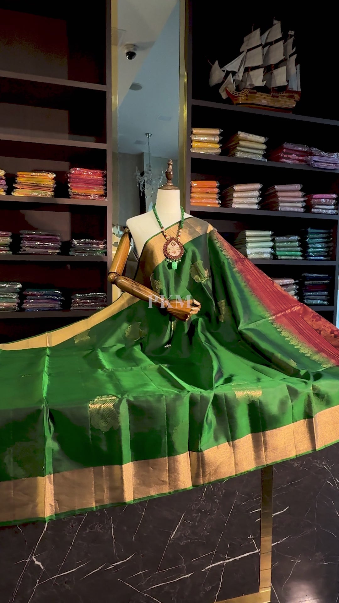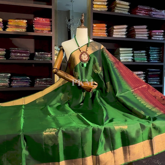 A stunning statement piece, this saree is crafted from Pure Handloom Soft Silk in a Chili Green. The body is adorned with intricate, Gold Harp Motifs that are meticulously spaced for a touch of refined elegance. Vibrant Deep Maroon Pallu with Gold Jari and Gold Tissue Borders