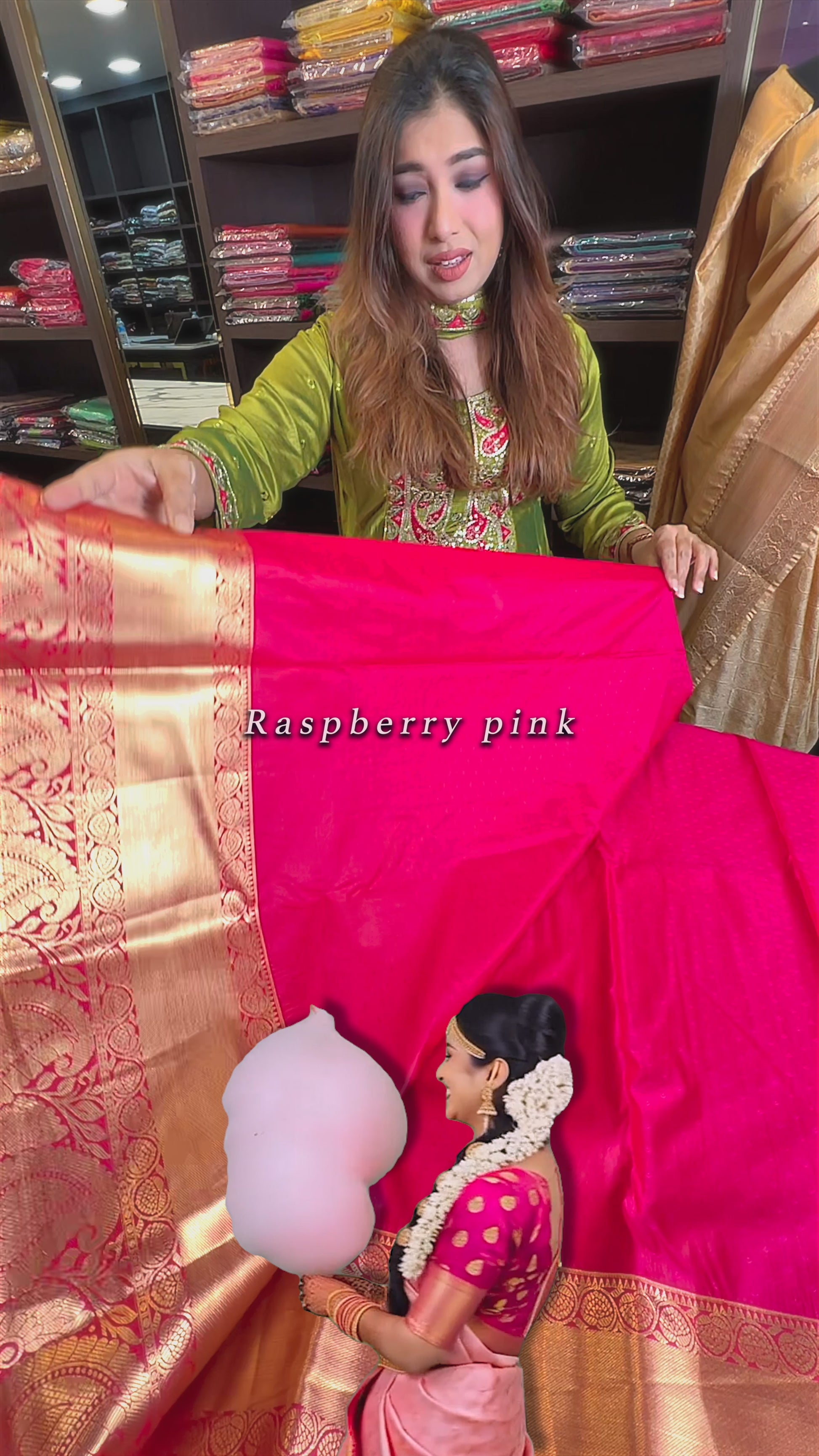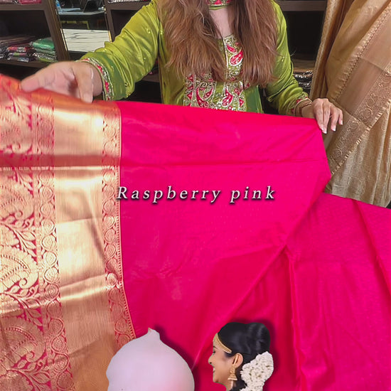Cotton Candy Pink semi-silk saree, beautifully adorned with Gold Flower Motif brocade woven across the body. The look is completed with a contrasting Raspberry pink Pallu and a Gold Pink Borders