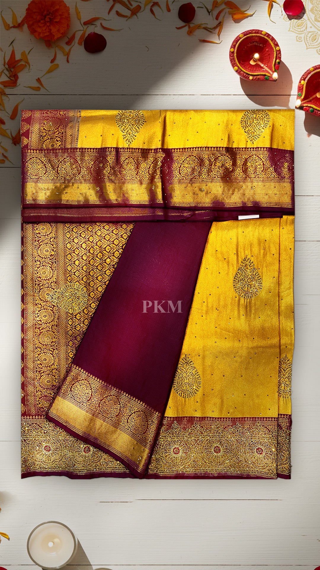 Crimson Gold Semi Silk Saree featuring a striking interplay of Gold Rhinestone and Swarovski Work woven seamlessly throughout the Body. The elegance is elevated with a contrasting Crimson Purple Gold Pallu, beautifully framed by Rhinestone Work Borders for a luxurious finish.