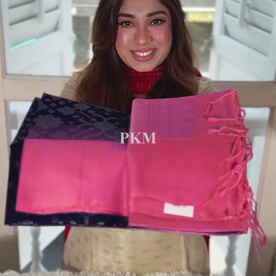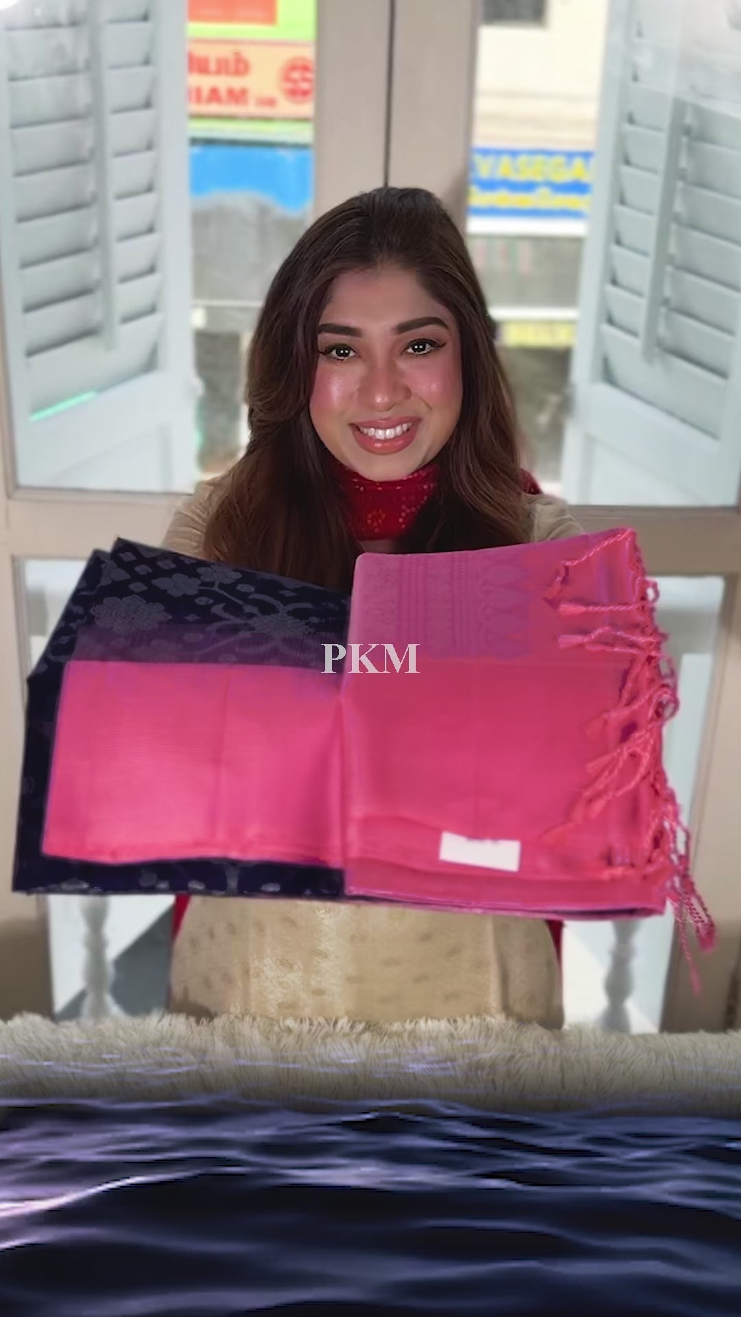 A stunning statement piece, this saree is crafted from Pure Handloom Soft Silk in a Deep Blue. The body is adorned with intricate, Silver Flower motifs that are meticulously spaced for a touch of refined elegance. Vibrant Coral Pink Borders and Pallu with Silver Jari.