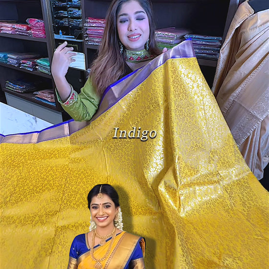 Elumichai Yellow Lemon semi-silk saree, beautifully adorned with Gold Flower brocade woven across the body. The look is completed with a contrasting Indigo Purplish Blue pallu