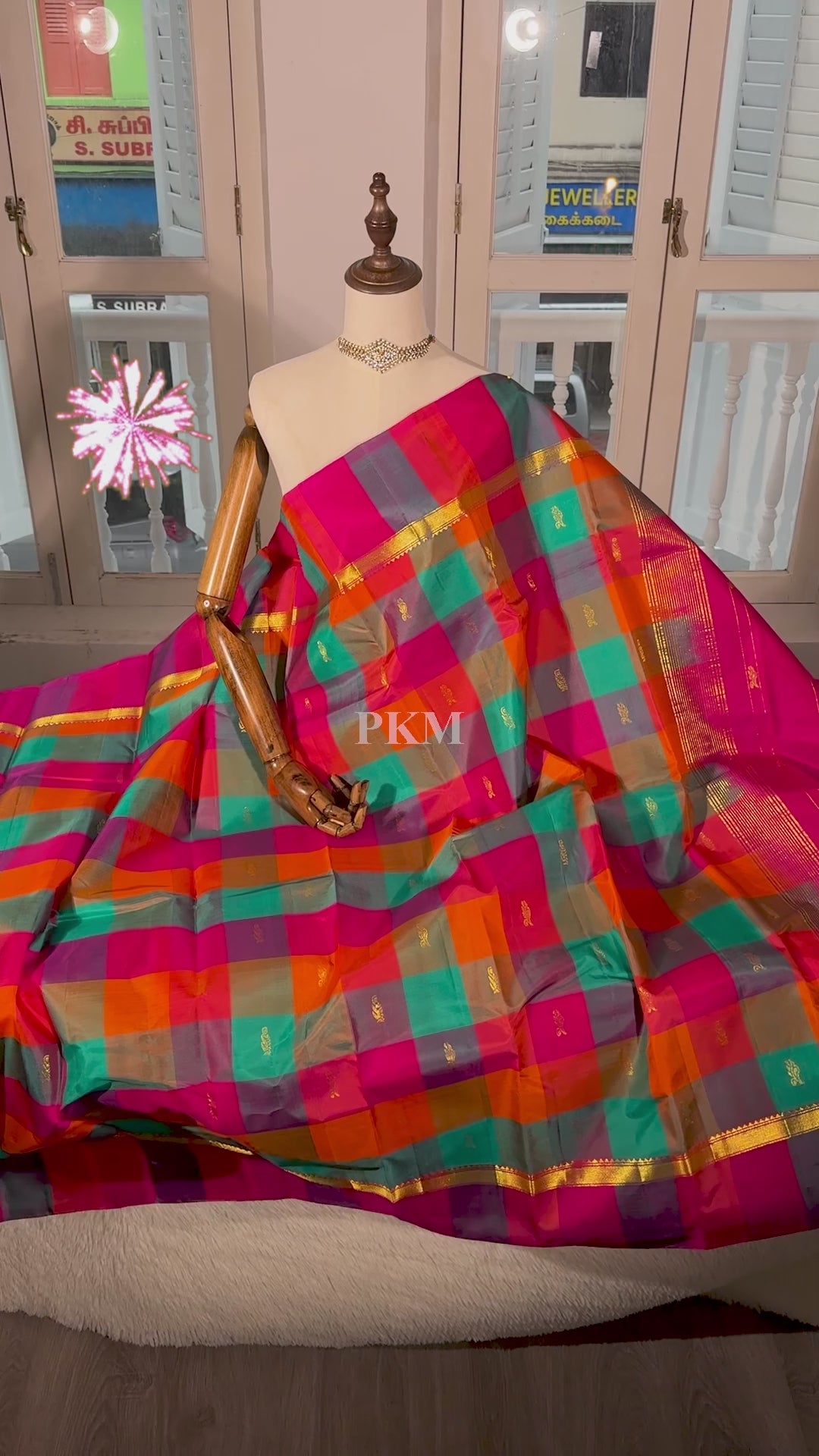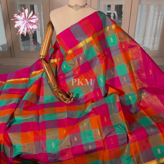 Multi Colored Checks Pure Handloom Korvai Soft Silk with Gold Flower Jari Motifs weaved all over the Multi Colored Checks body. Gold Flower weaved all over the Contrast Vibrant Pink Pallu.