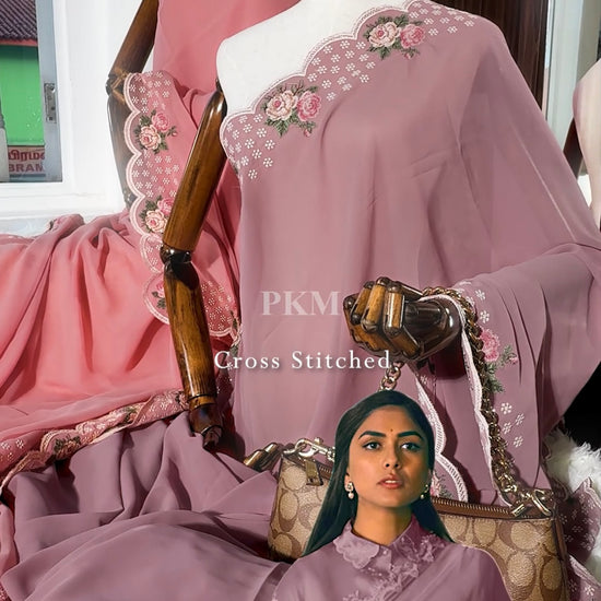 Cross Stitched Floral Motifs Embroidered on a Mauve Purple Faux Georgette sari with 4 inch Scallop borders.