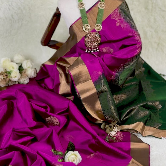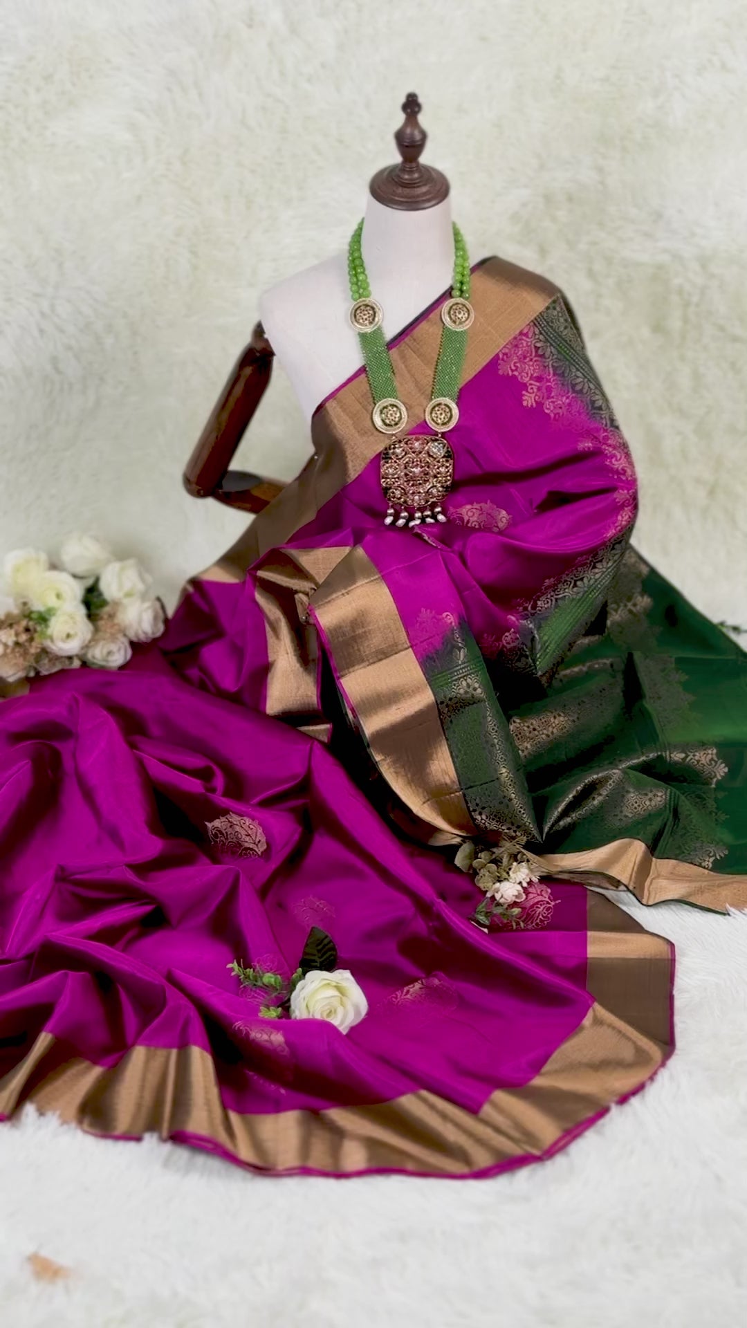 A stunning statement piece, this saree is crafted from Pure Handloom Soft Silk in a Fuchsia Purple. The body is adorned with intricate, Antique Gold Flower Motifs that are meticulously spaced for a touch of refined elegance. Vibrant Saiam Green Pallu with Gold Jari and Gold Tissue Borders