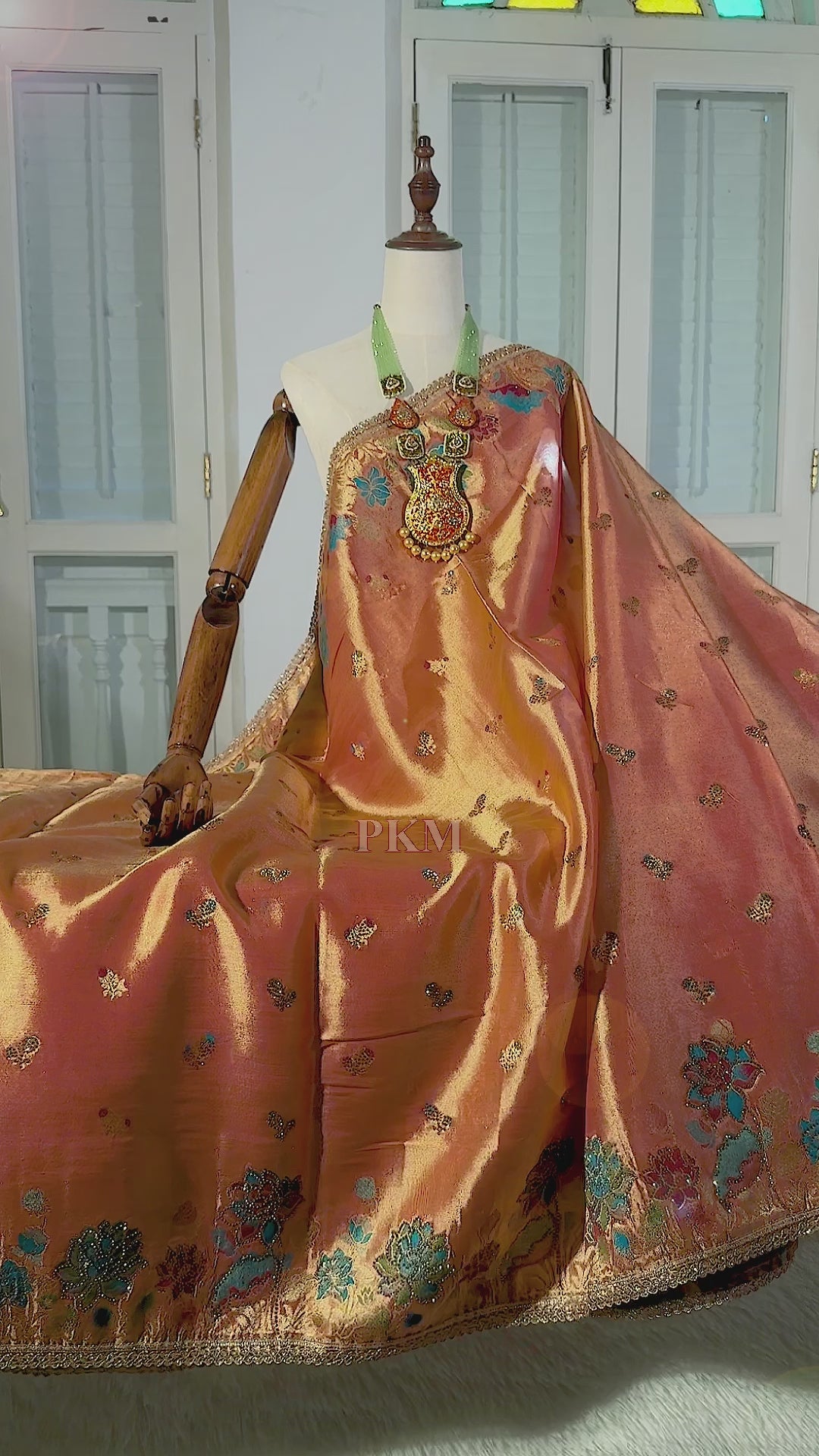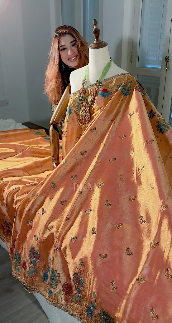 Orange Gold Lava Shade Semi Tissue Silk saree features a striking combination of gold Swarovski Rhinestone work seamlessly throughout the body. The saree's elegance is highlighted by its running Shiny Orange Gold Lava Shade pallu, all tied together with delicate Lace Applique borders and the classic touch of Benarasi weaving.