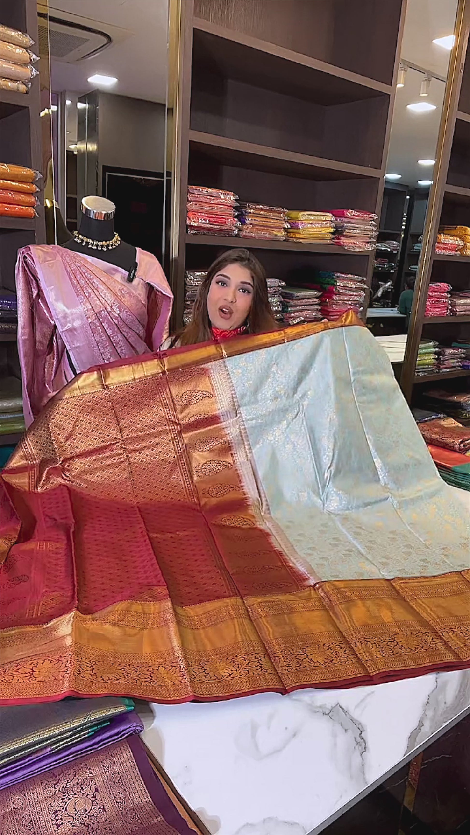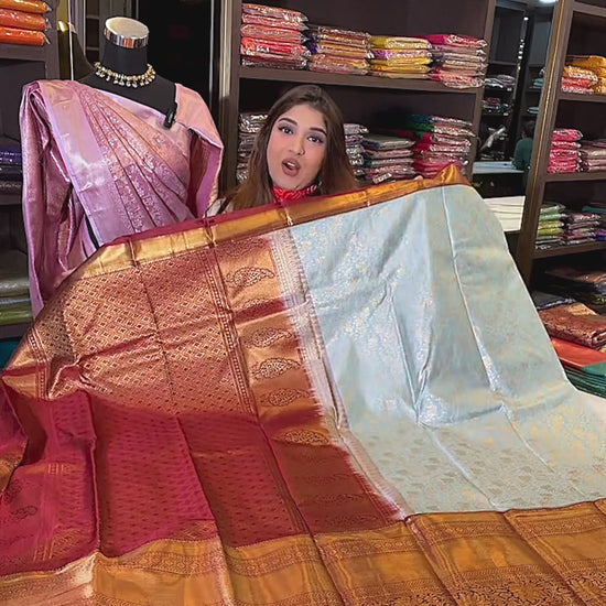 Ice Blue semi-silk saree, beautifully adorned with antique gold jari woven across the body. The look is completed with a contrasting kungumapoo pallu and matching blouse for a striking finish.