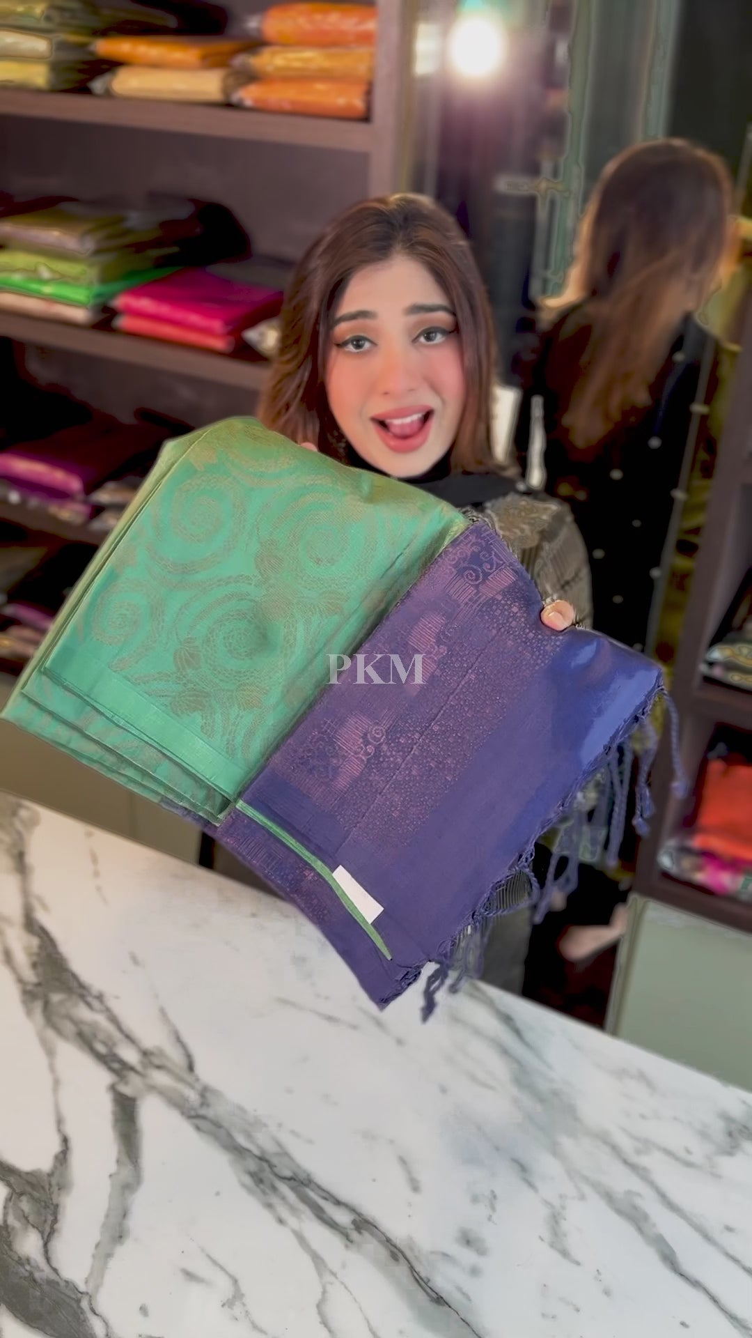 A stunning statement piece, this saree is crafted from Pure Handloom Brocade Soft Silk in a Mint Frost. The body is adorned with intricate, Copper Swirl Motifs that are meticulously spaced for a touch of refined elegance. Vibrant Frozen Blue Pallu with Copper Jari.