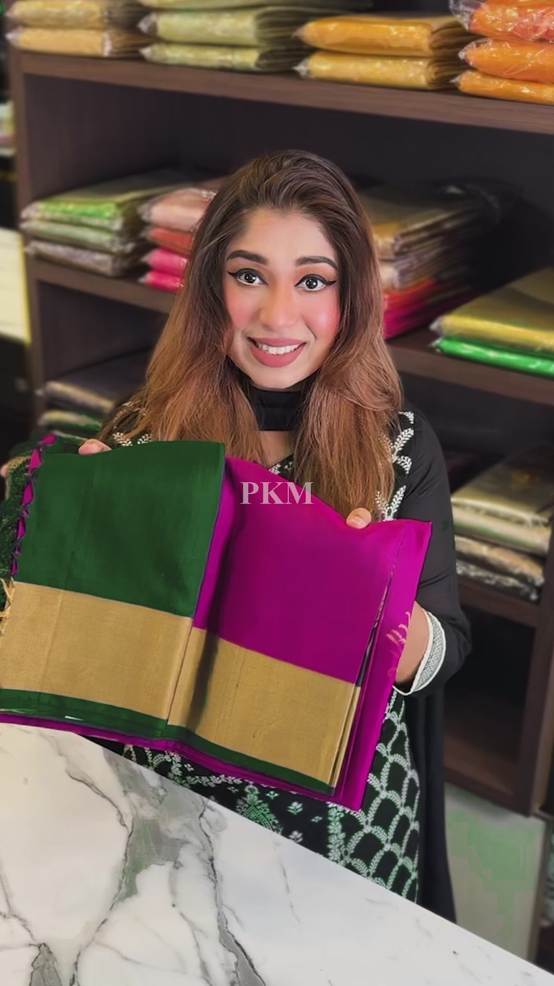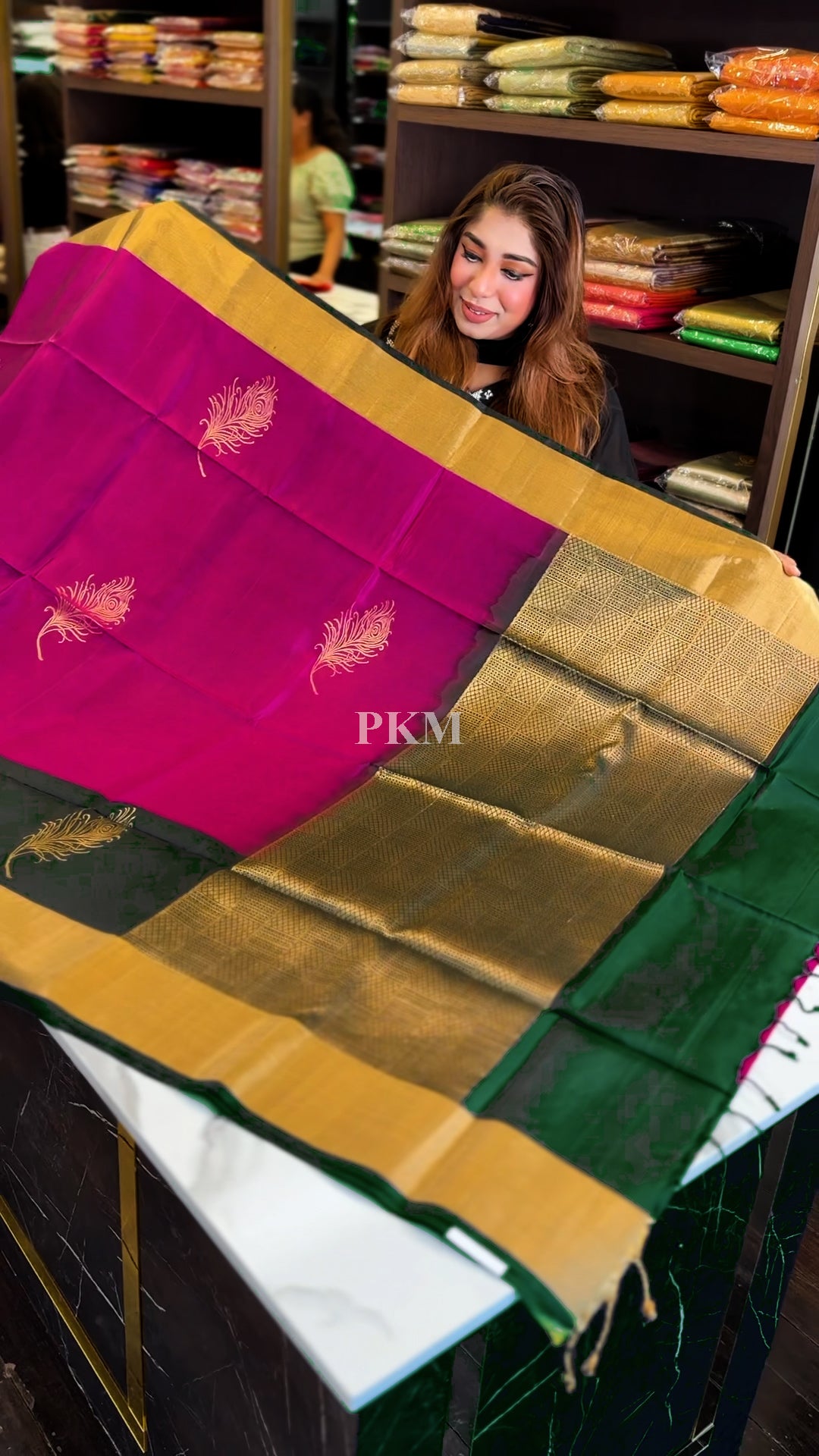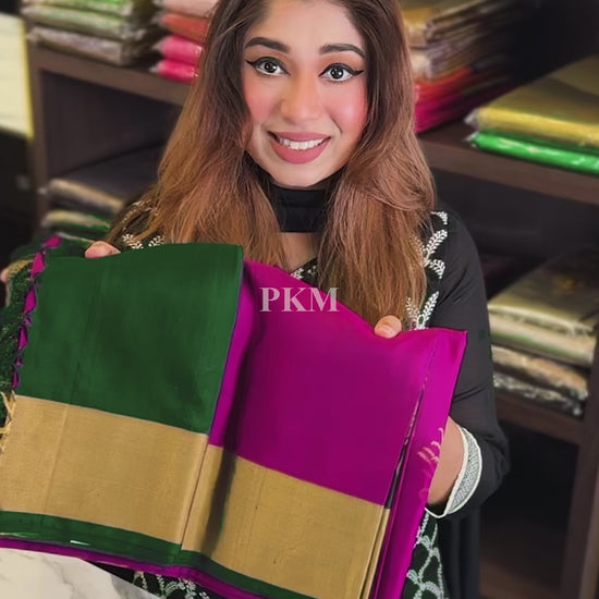 A stunning statement piece, this saree is crafted from Pure Handloom Soft Silk in a Deep Magenta. The body is adorned with intricate, Gold Iragu motifs that are meticulously spaced for a touch of refined elegance. A vibrant Forest Green, framed by sophisticated Gold Jari Tissue Borders.
