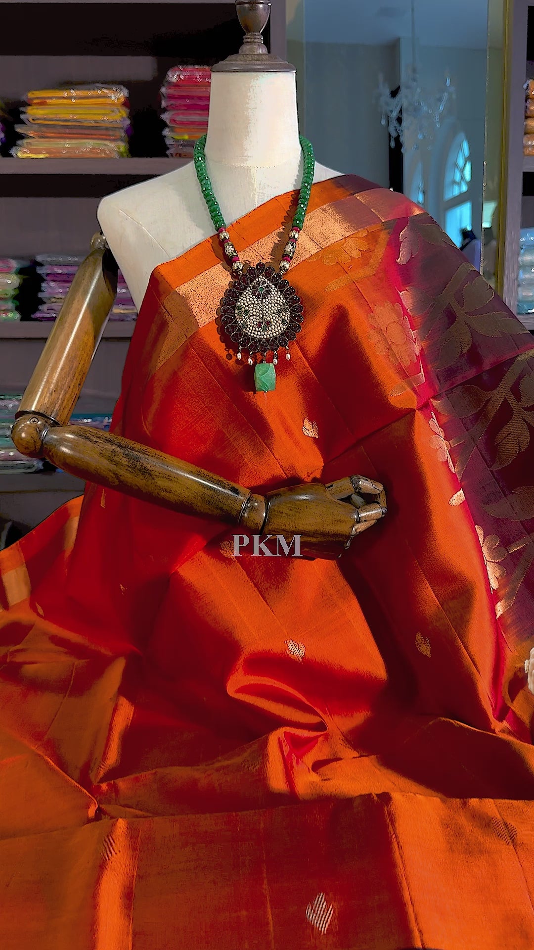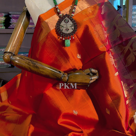 Jalebi Orange Shade Pure Handloom Soft Silk with Gold Flower Motifs woven all over the Body. The contrasting Saffron Maroon Pallu and Borders are adorned with Gold Jari Flower Motifs for a majestic finish.