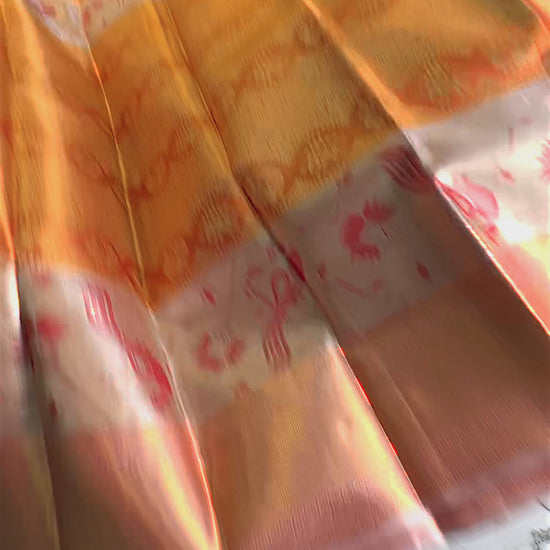 Kaasu Butta semi-silk saree, beautifully adorned with Gold Silver Elephant Coin Motif brocade woven across the body. The look is completed with a contrasting Copper Gold Shade Pallu.