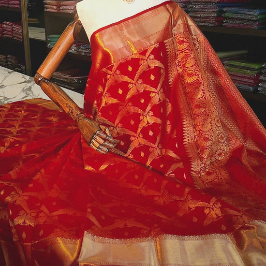 A striking Kungumam Red Shade, this Pure Handloom Brocade Kanchipuram Silk Saree is adorned with delicate Gold Rettai Kili motifs woven all over the body, exuding subtle elegance.