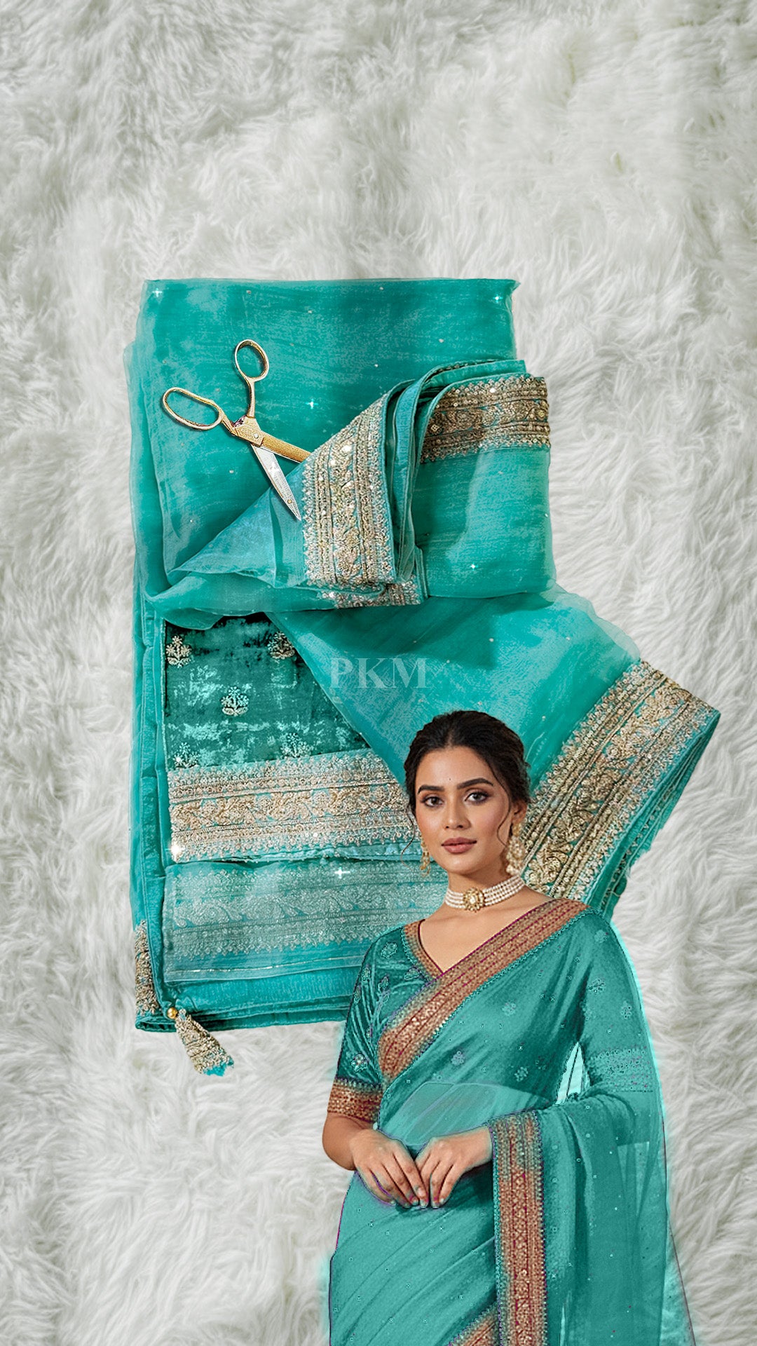 Grace meets elegance in our Lagoon Turquoise organza saree. Featuring Gold flower embroidery along the borders and motifs, this saree drapes light and airy for all day comfort.