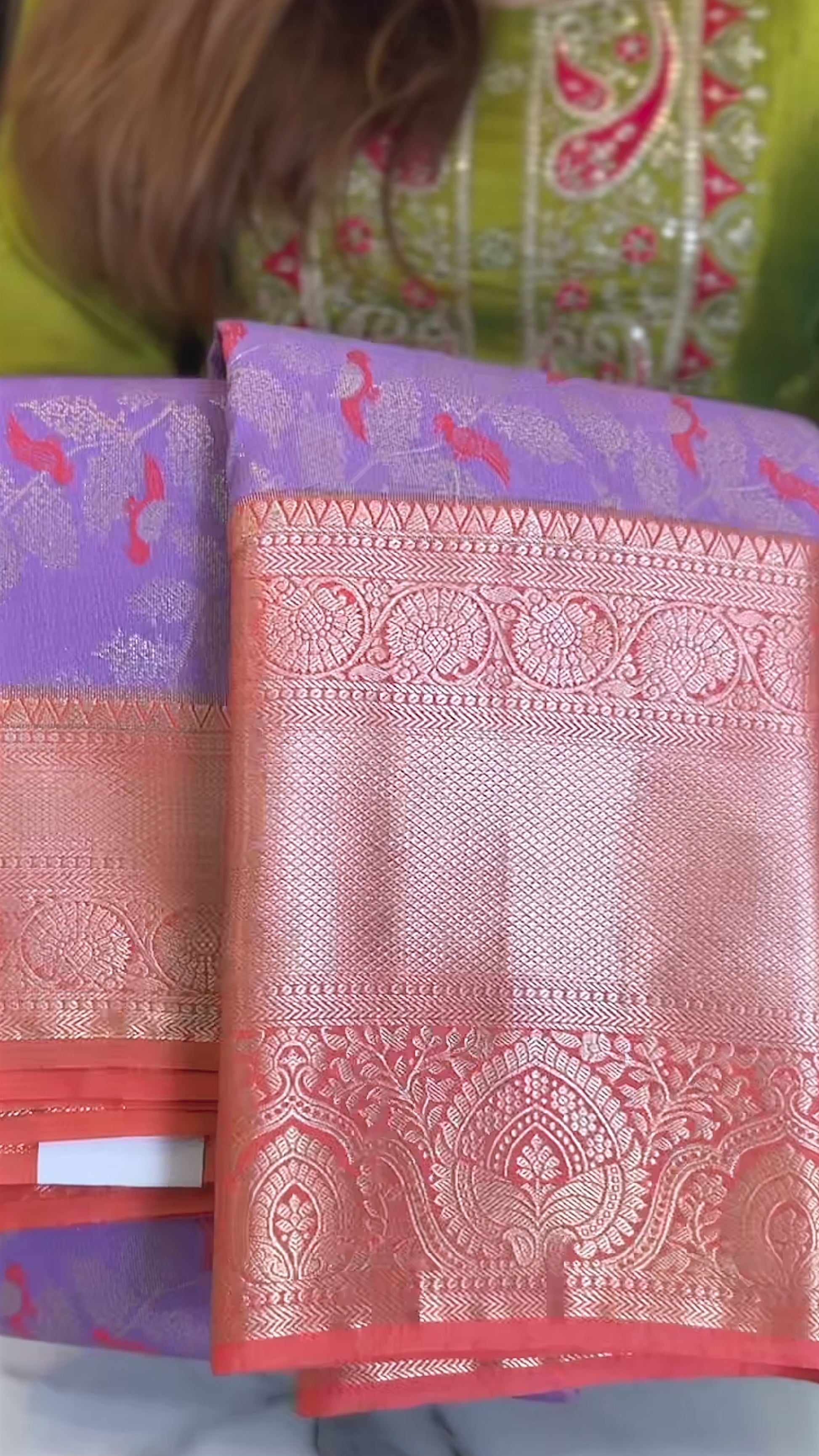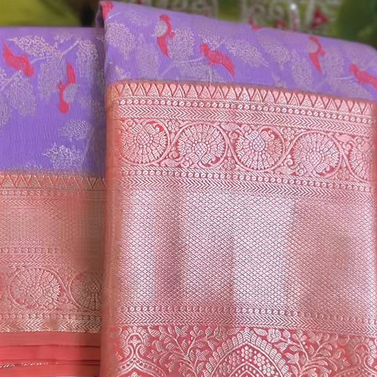 Lilac Purple semi-silk saree, beautifully adorned with Gold Flower brocade woven across the body. The look is completed with a contrasting Red Rose Pallu .