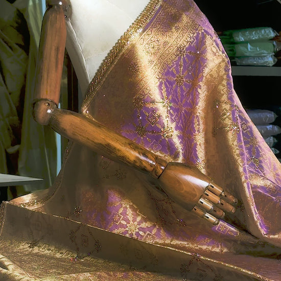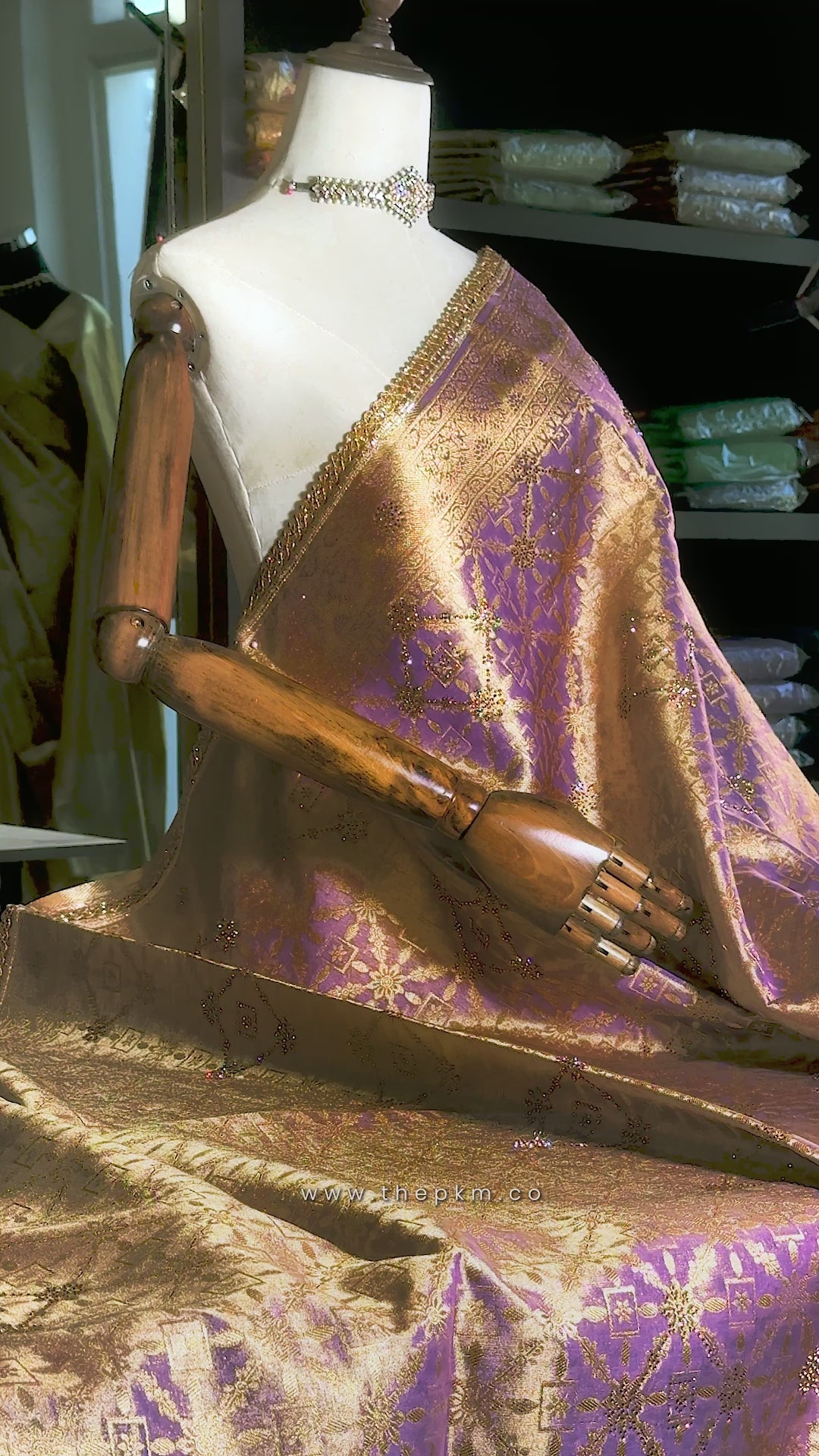 Lilac Gold Tissue Silk Saree featuring a striking interplay of Gold Rhinestone and Swarovski Work woven seamlessly throughout the Body. The elegance is elevated with a running Lilac Gold Pallu, beautifully framed by Rhinestone Work Borders for a luxurious finish.