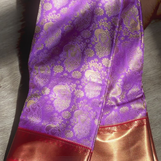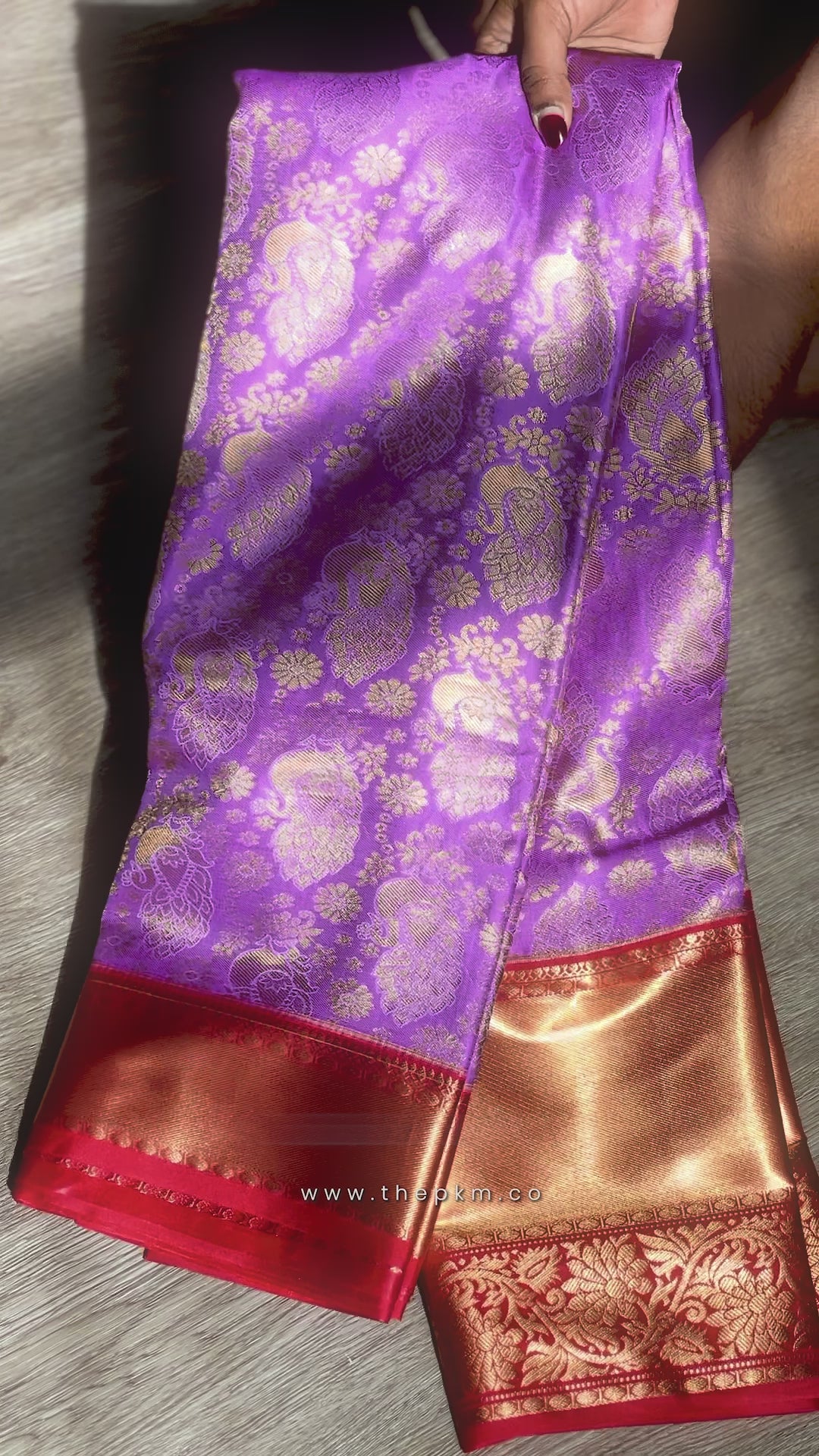 Lilac Mist Purple semi-silk saree, beautifully adorned with Gold Mayil brocade woven across the body. The look is completed with a contrasting Amber Red Pallu with Gold Floral borders.
