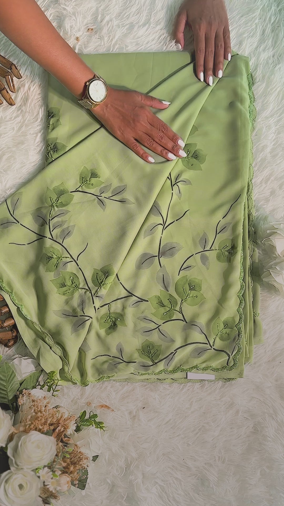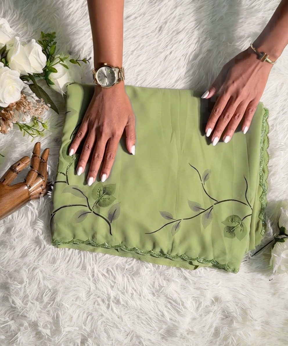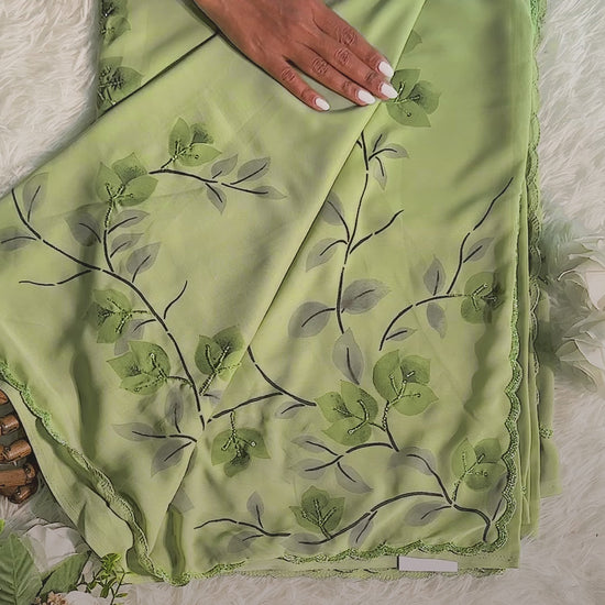 Brush Paintings Floral Motifs Prints with Sequin & Beading works on a Matcha Green Georgette sari with 1 cm Scallop borders.