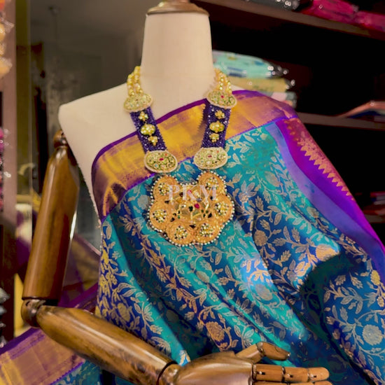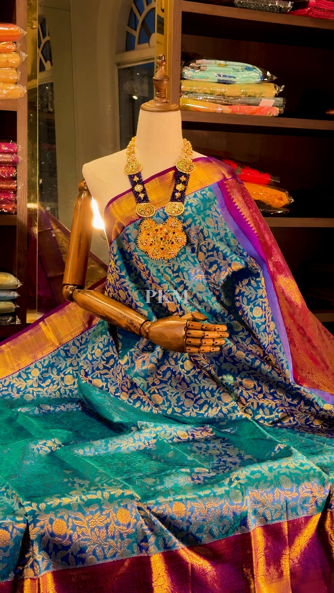 Mayil Blue Shade Pure Handloom on Deep Magenta Brocade Kanchipuram Saree.