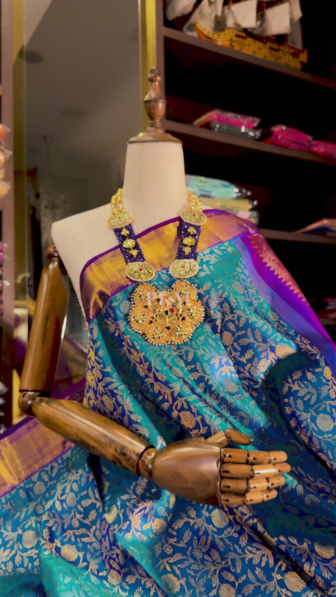 An elegant Mayil Blue shade, this Pure Handloom Brocade Kanchipuram Silk Saree features delicate Gold Flower Brocade Design woven all over the body.