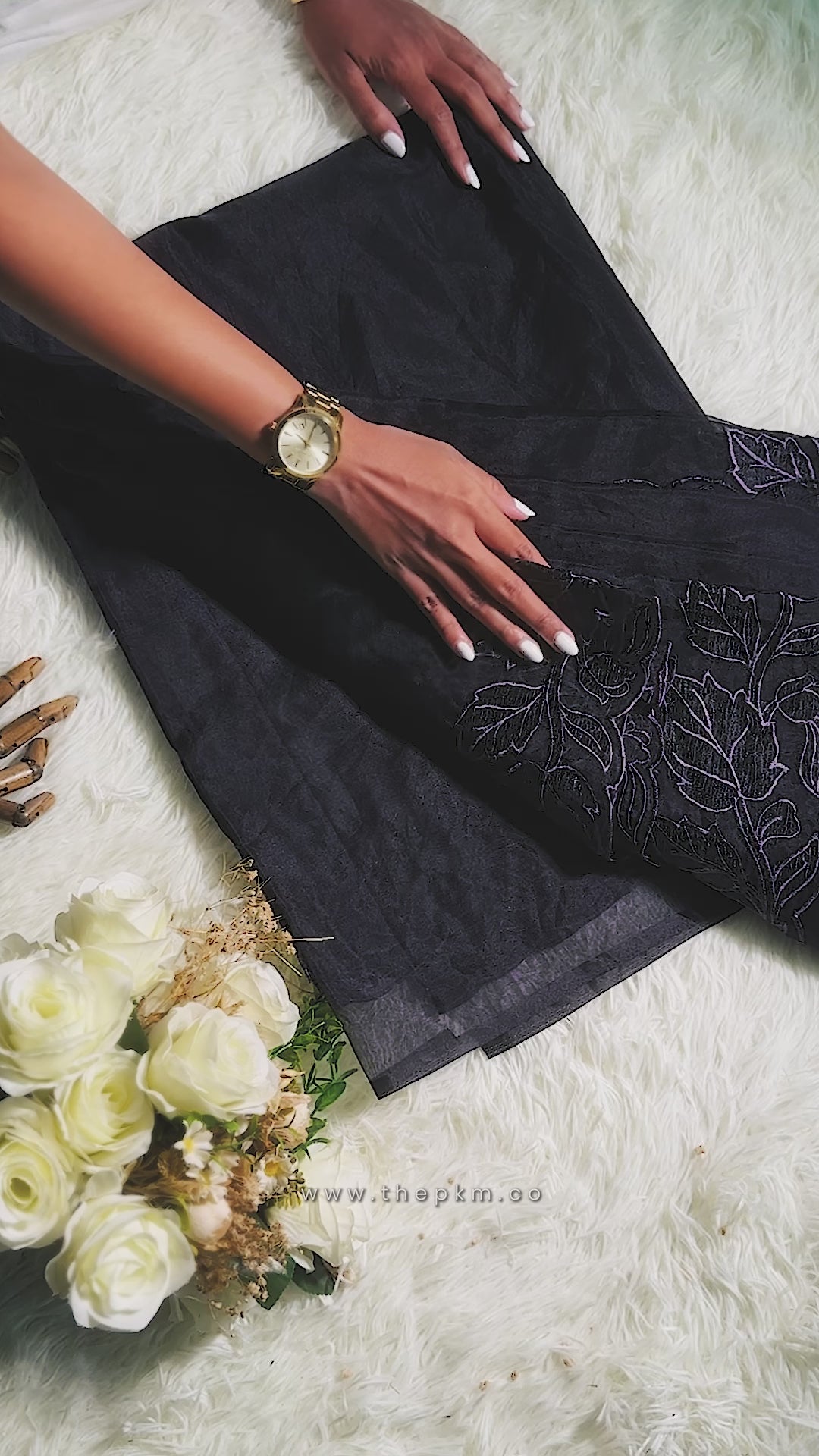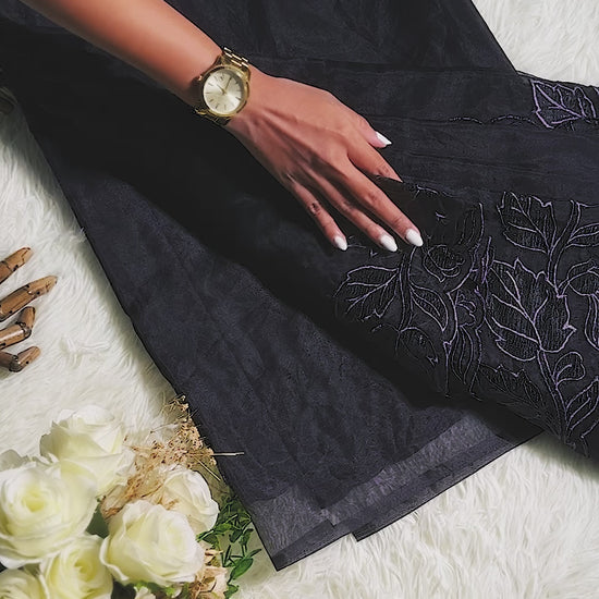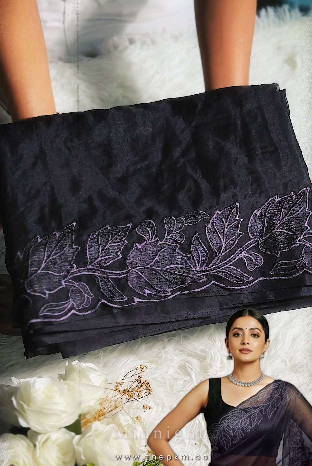 Grace meets elegance in our Midnight Black glass organza saree. Featuring appliqué work along the border, this saree drapes light and airy for all day comfort.