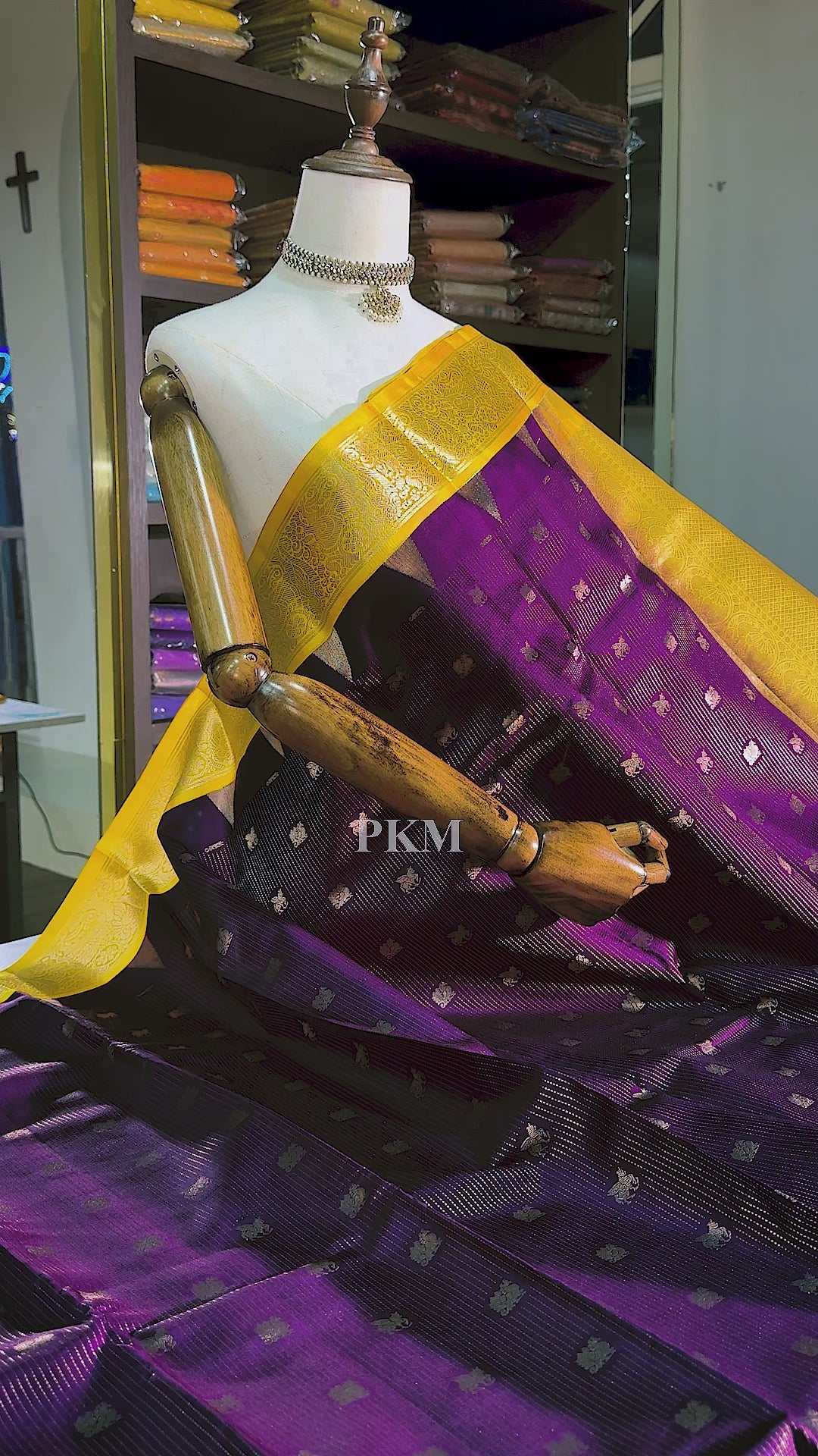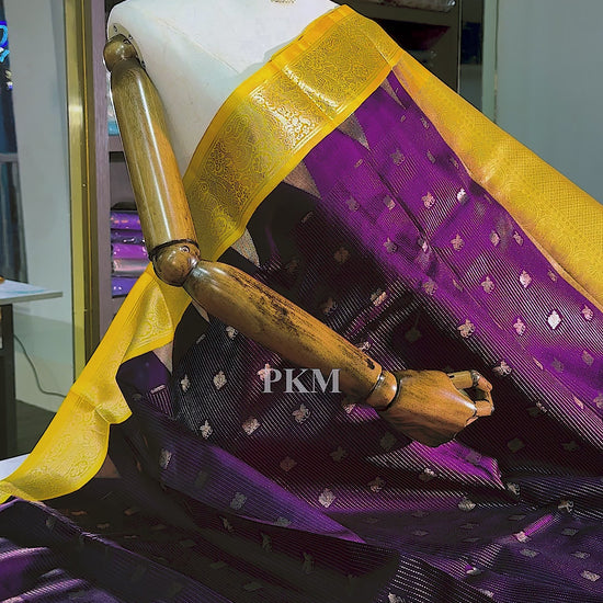 M.S. Amma Inspired, Pure Handloom Soft Silk with Gold Jari Stripes and Mayil & Pegasus Motif weaved all over the Deep Violet body and Manjal Yellow Gold Yazhi Motif & Temple Turning borders, contrast Manjal Yellow Gold Pallu.