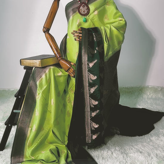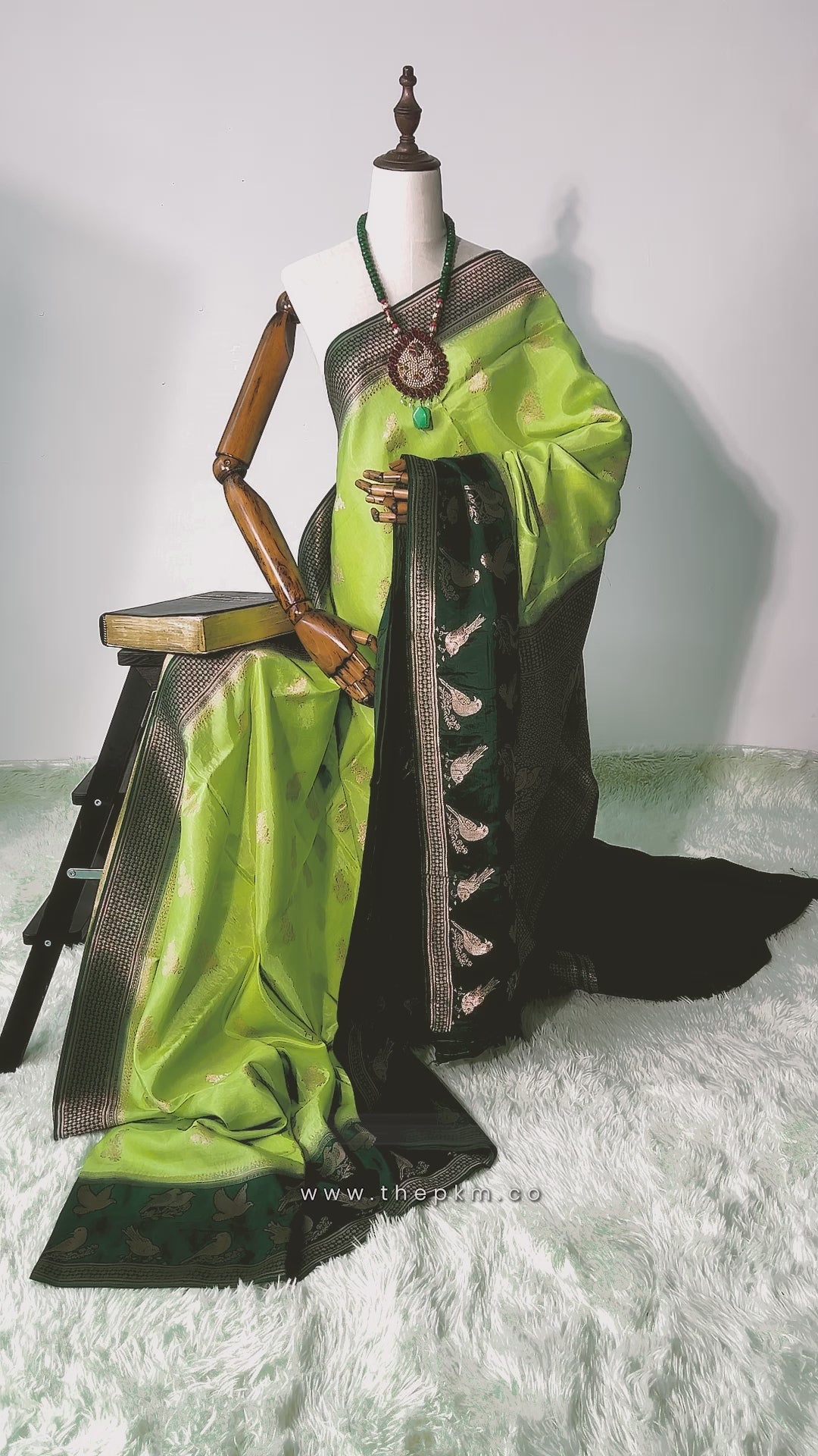 Nellikai Gooseberry Green on Dark Green mysore semi-silk saree, beautifully adorned with Gold Flower Motif woven across the body. The look is completed with a contrasting Dark Green Pallu and Gold Sparrow Motifs weaved across the Benarasi Weaving Border .