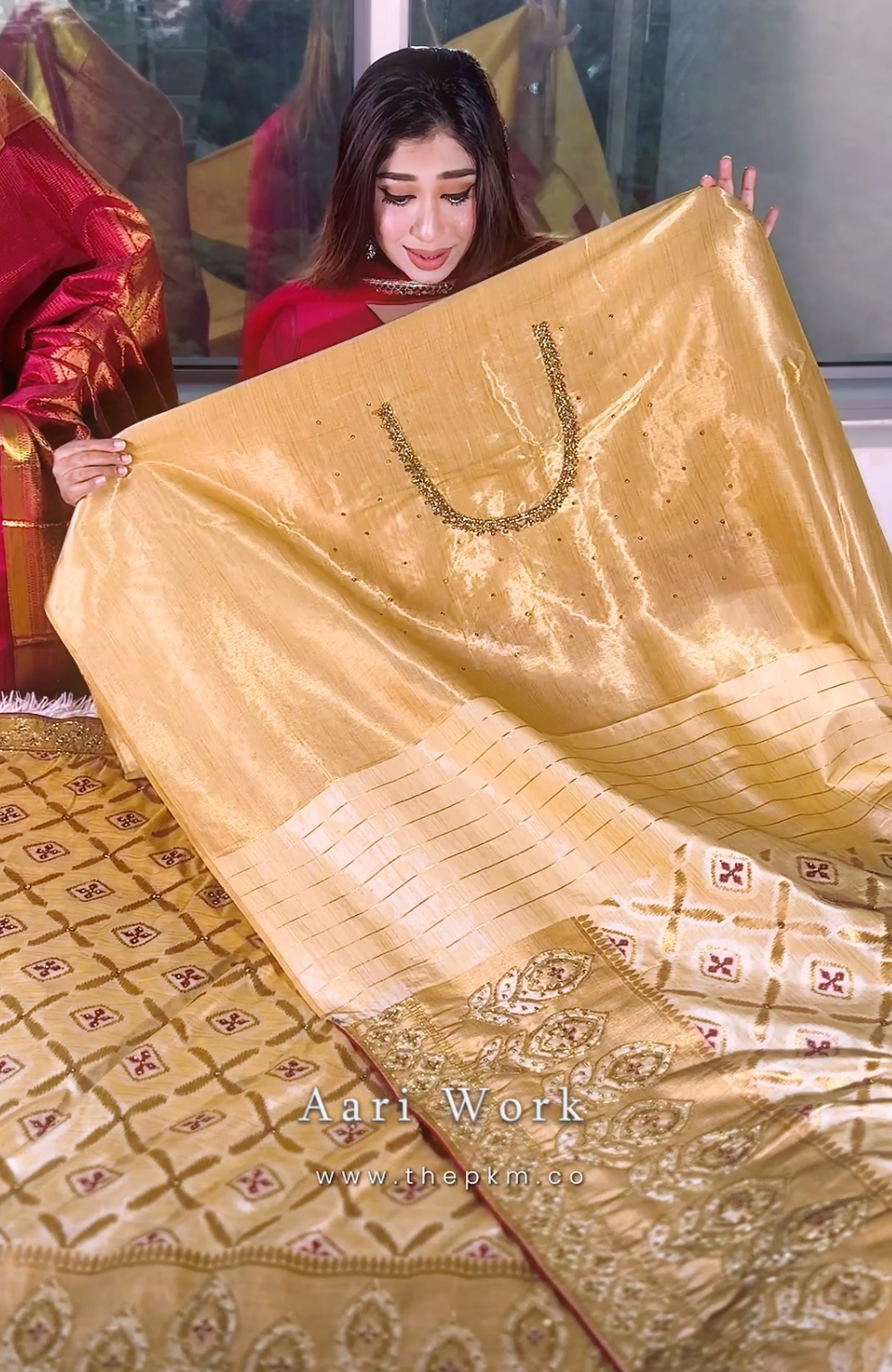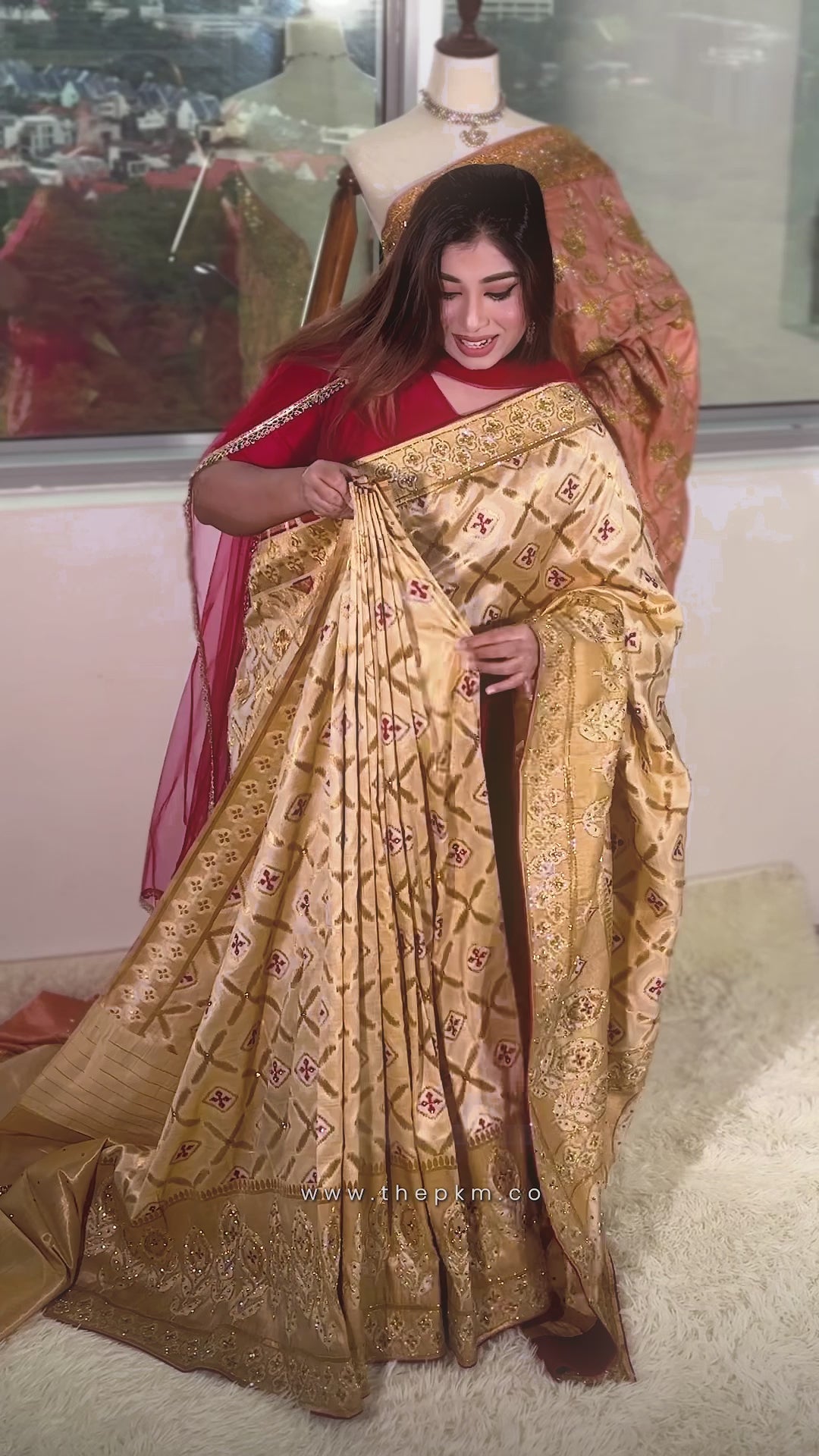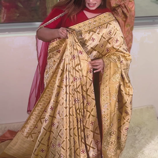 Nirapara Gold Floral Motifs Embroidered on a Gold hand work moonga silk sari with 10.5 inch borders.
