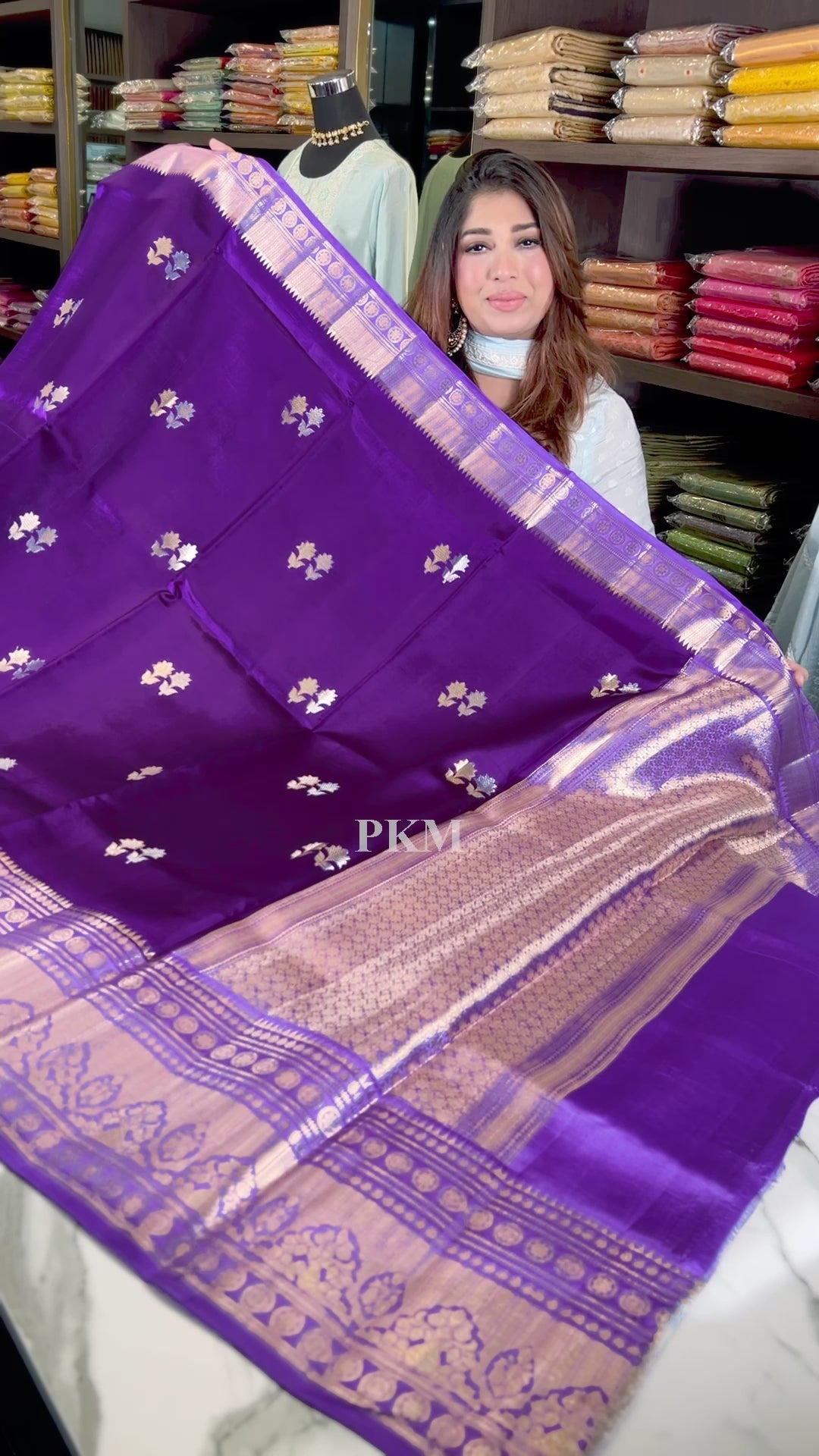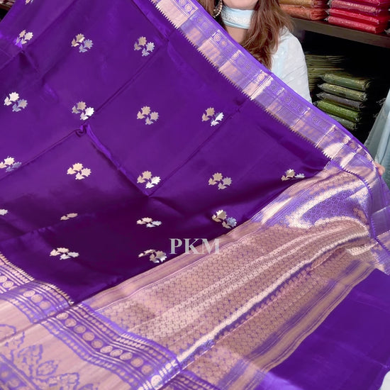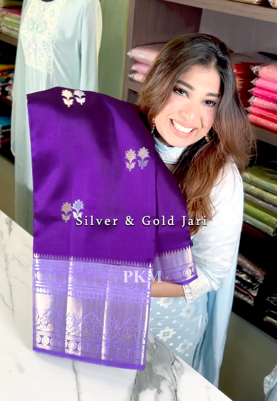 Onion Purple Tone Pure Raw Mango Tussar Handloom Silk with Silver & Gold Flower Motif weaved all over the body and across the Gold Benarasi border. Contrast Pallu in Lavender Onion Purple .