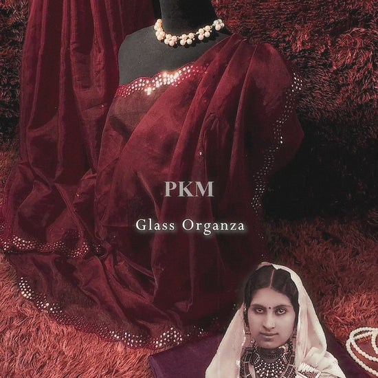 Palace Rouge Red Exquisite glass organza with a timeless Maharani aesthetic. Delicate foil mirror scallop border for subtle brilliance and