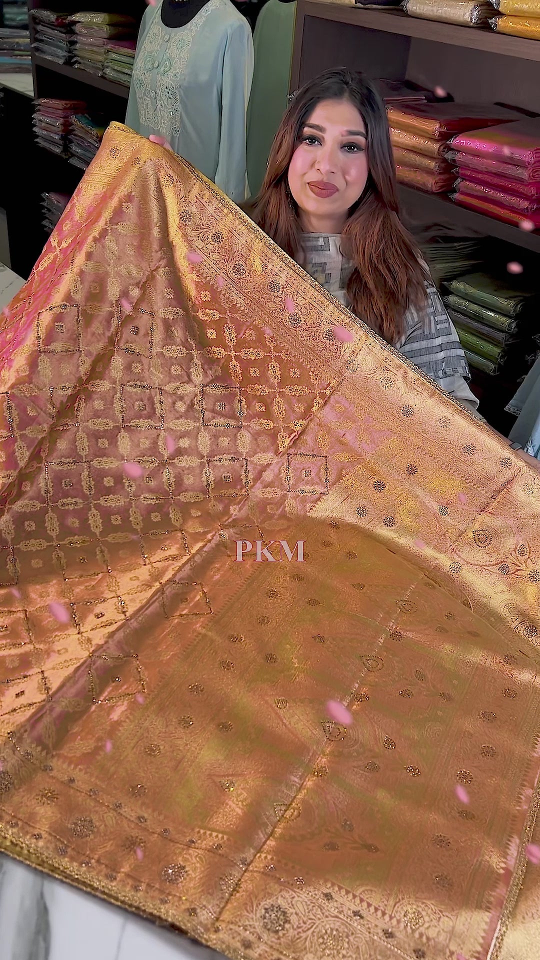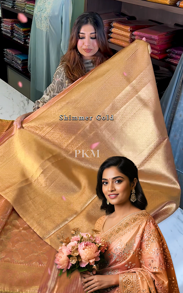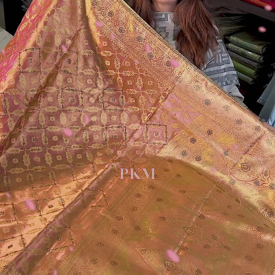 Peony Gold Orange Pinkish Semi Silk saree features a striking combination of gold Rhinestone and Swarovski work woven seamlessly throughout the body. The saree's elegance is highlighted by its running orange pink gold pallu all tied together with delicate Lace Applique borders and the classic touch of Benarasi weaving.