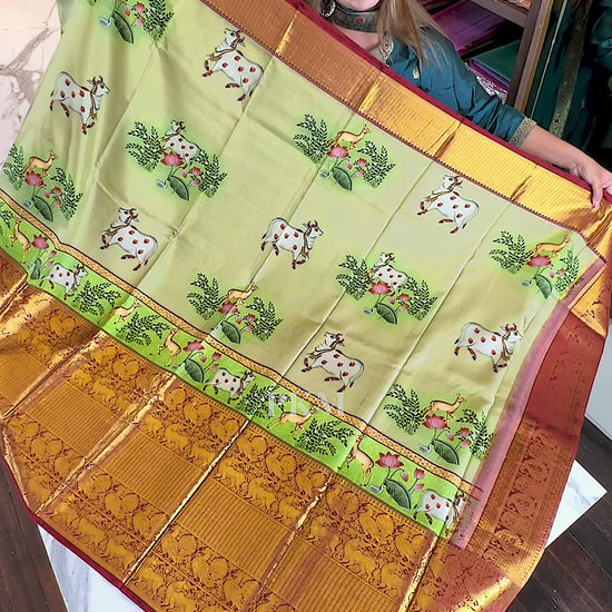 Pichwai Art: The saree body is adorned with charming, spaced-out motifs of sacred cows (Gau Mata), symbolizing prosperity and devotion, and bordered by a picturesque scene featuring deer, lotus flowers, and lush greenery.